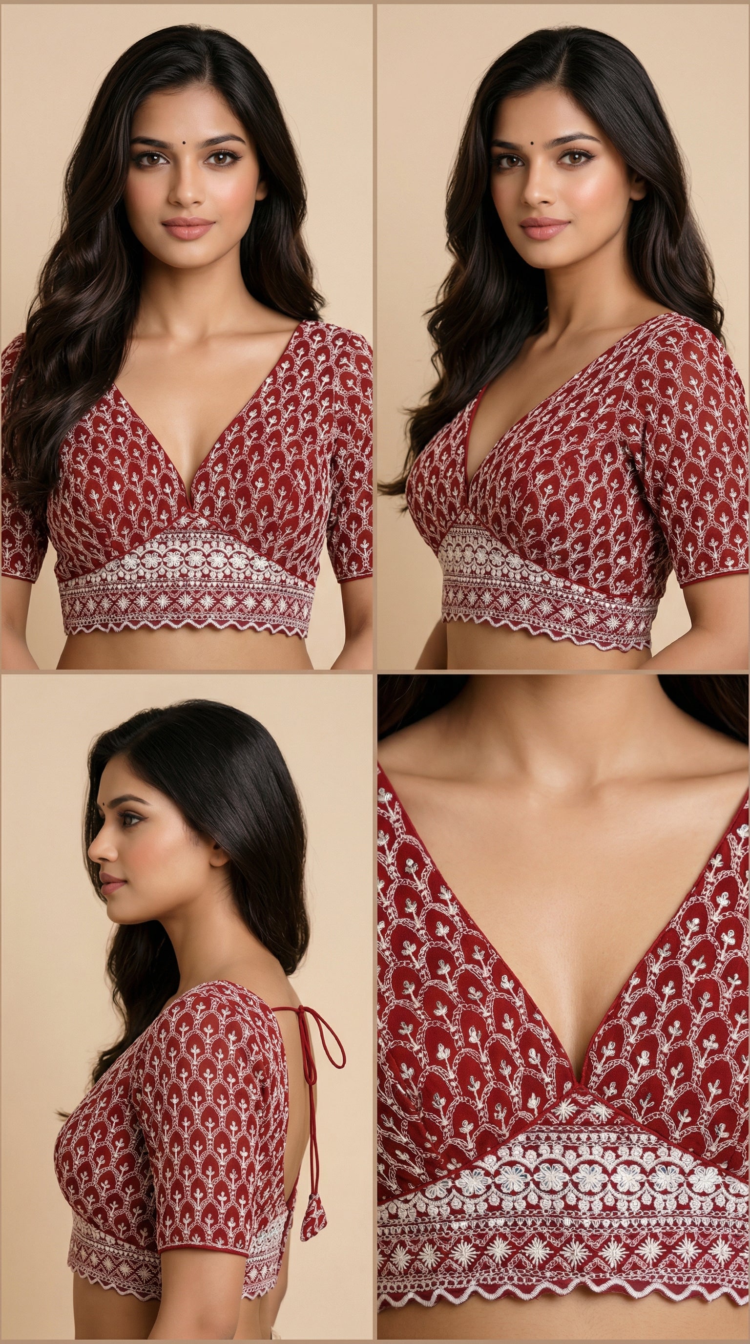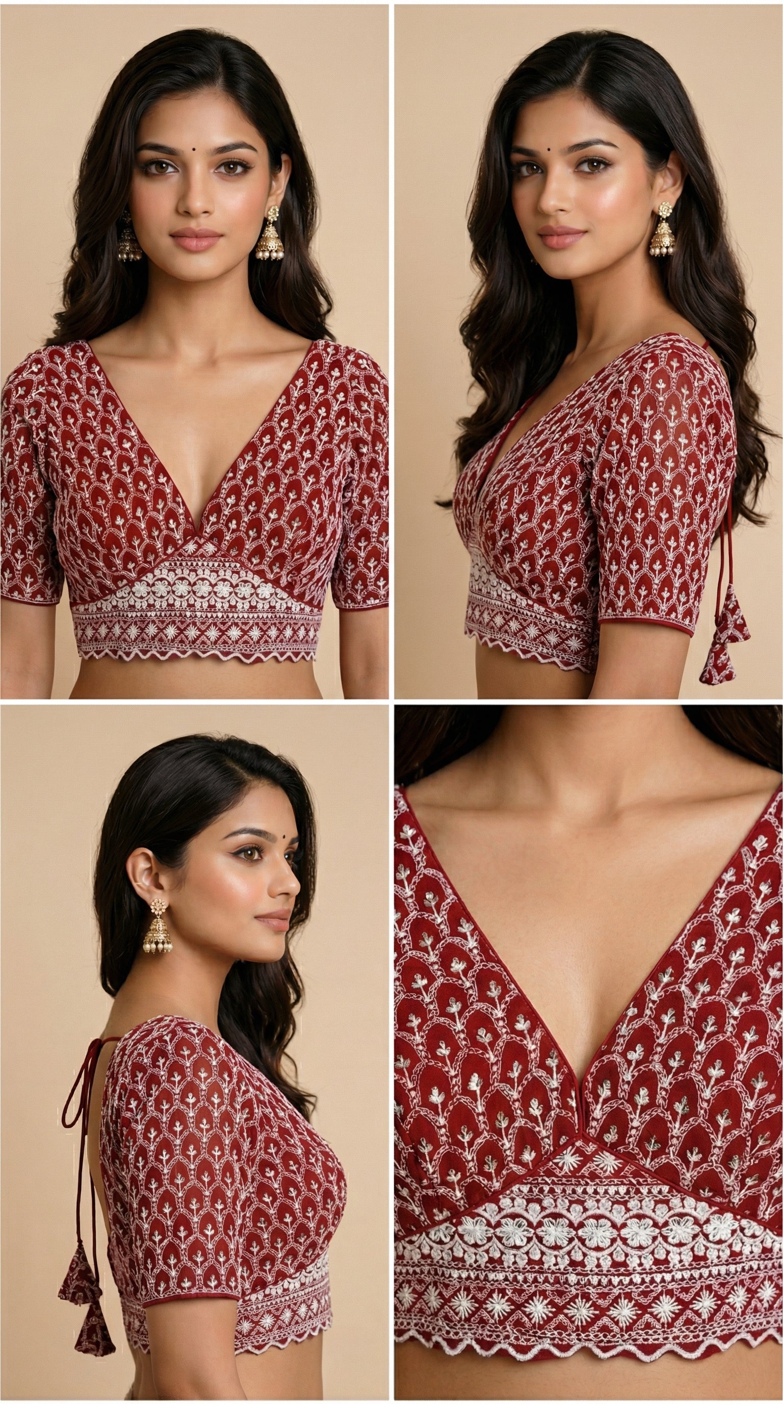 Elevate your saree styling with this premium Maroon Lucknowi Work Readymade Blouse, crafted in heavy fox georgette for a graceful fall and rich texture. Designed with a flattering V-neck and elegant back hook closure, this blouse delivers both structure and comfort.