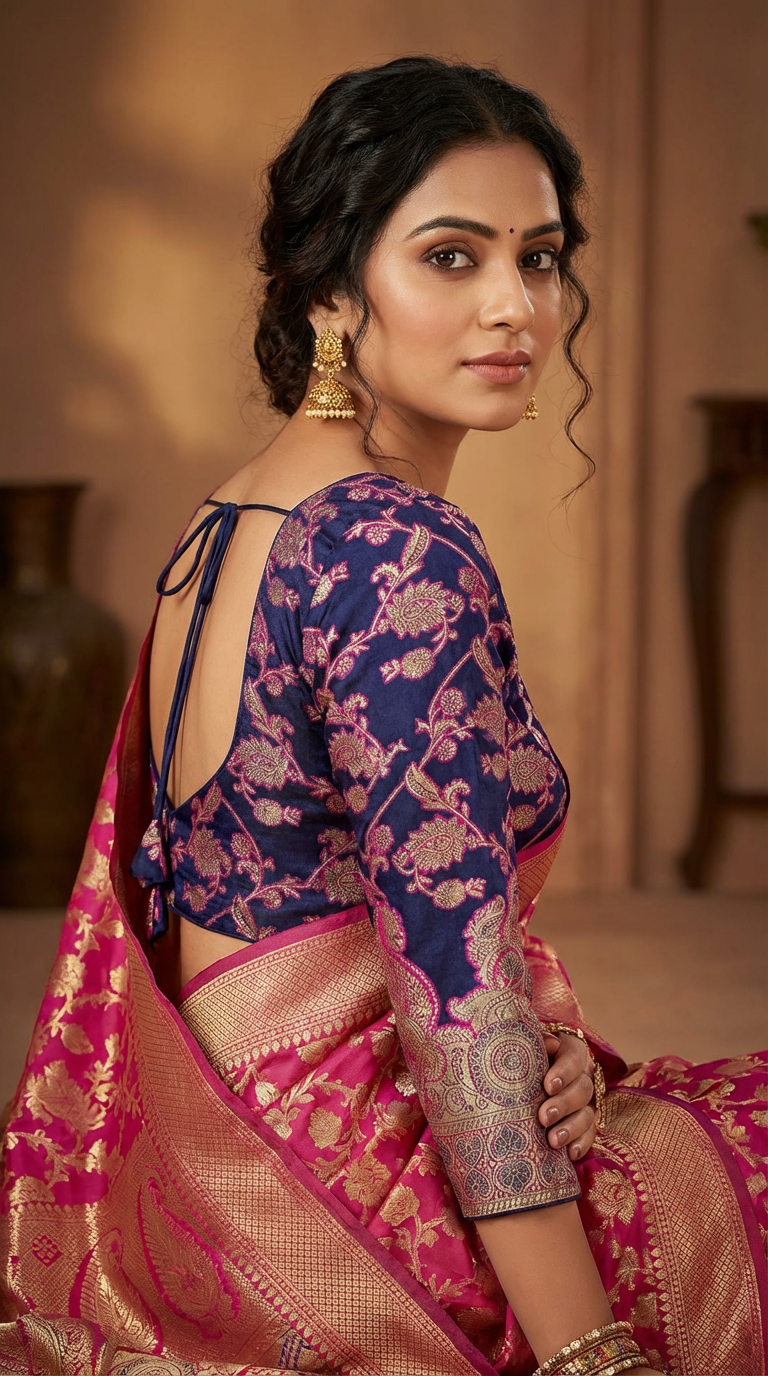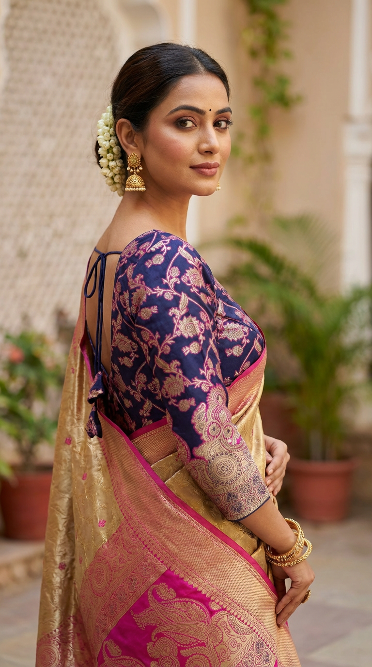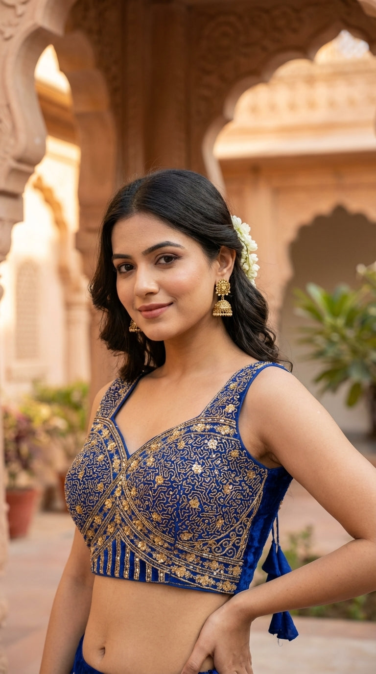 Vistavelle Navy Blue Color V-Neck Vichitra Silk Zari Work Blouse