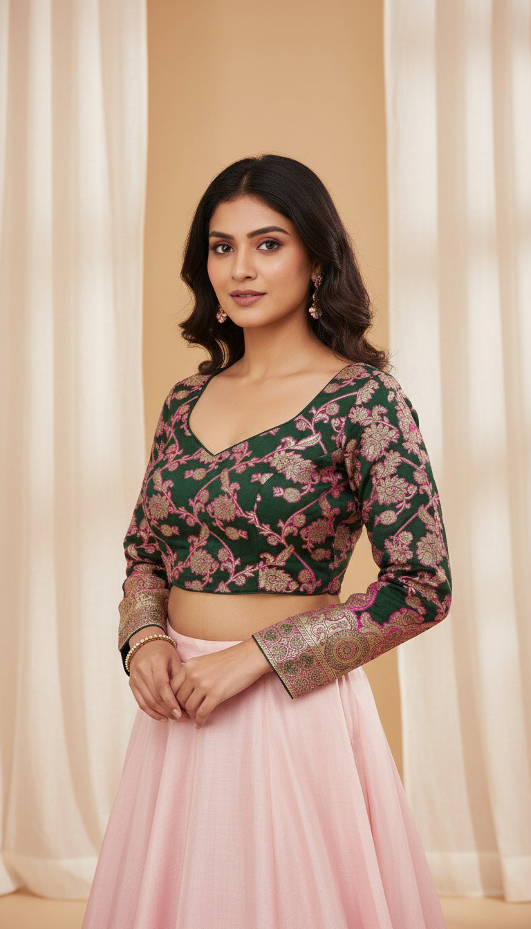 Vistavelle Green Color V-Neck Vichitra Silk Zari Work Blouse