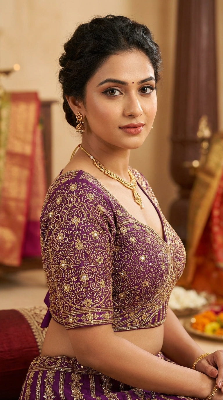 Vistavelle Purple Color V-Neck Vichitra Silk Zari with Sequin Embroidery Work Blouse