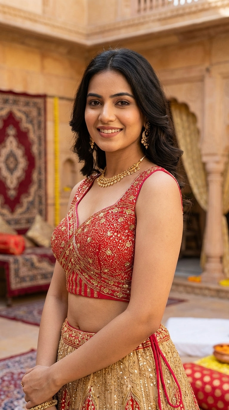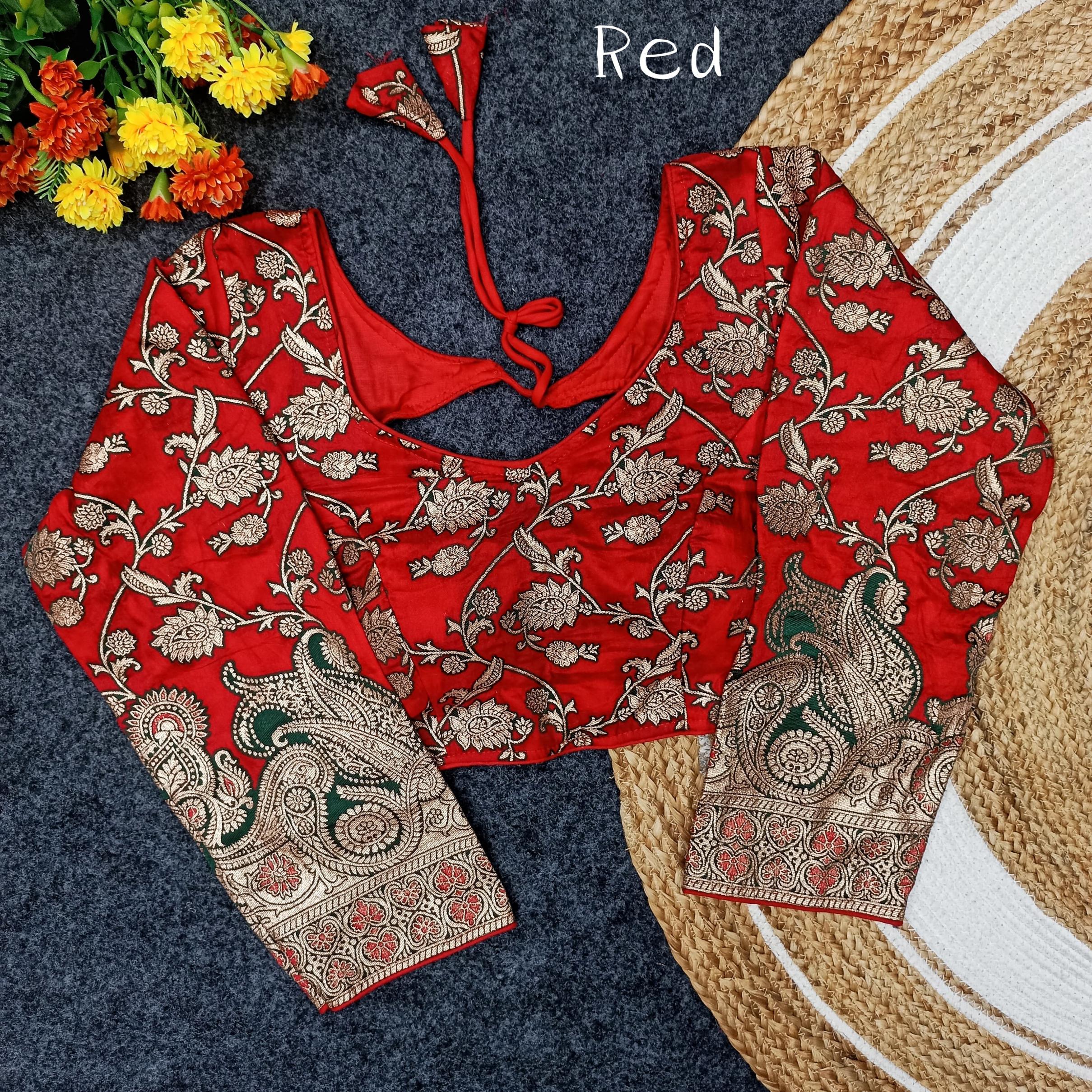 Vistavelle Red Color Round Neck Vichitra Silk Zari Work Blouse