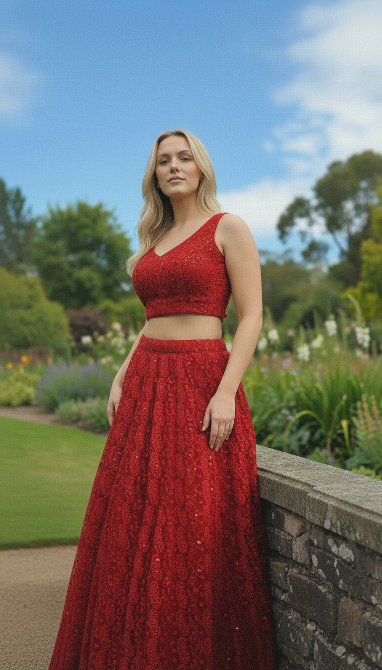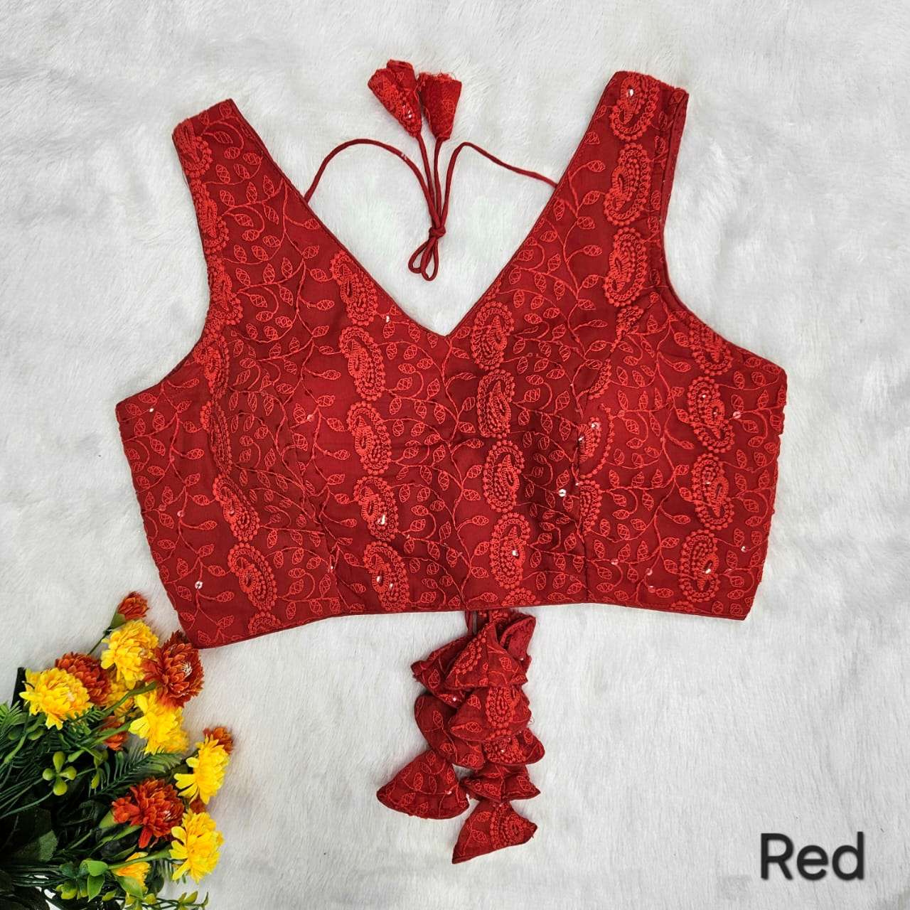 Vistavelle Red Color V-Neck PR Chikankari Georgette Digital Blouse