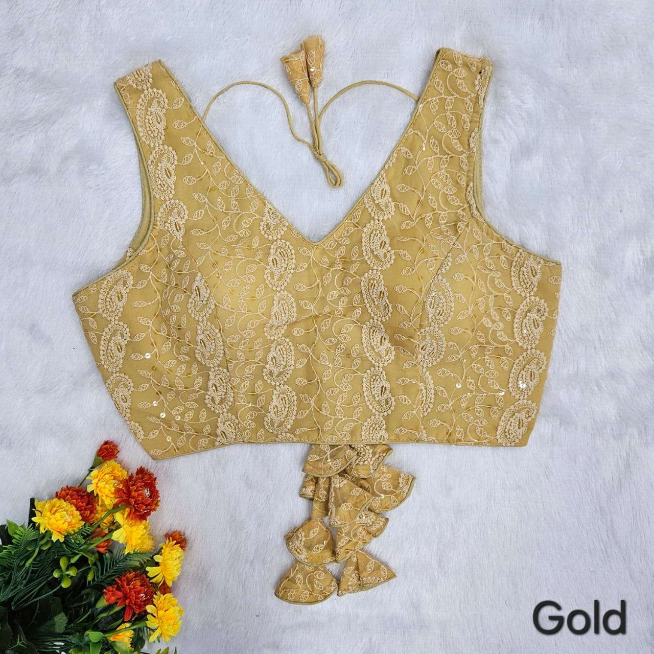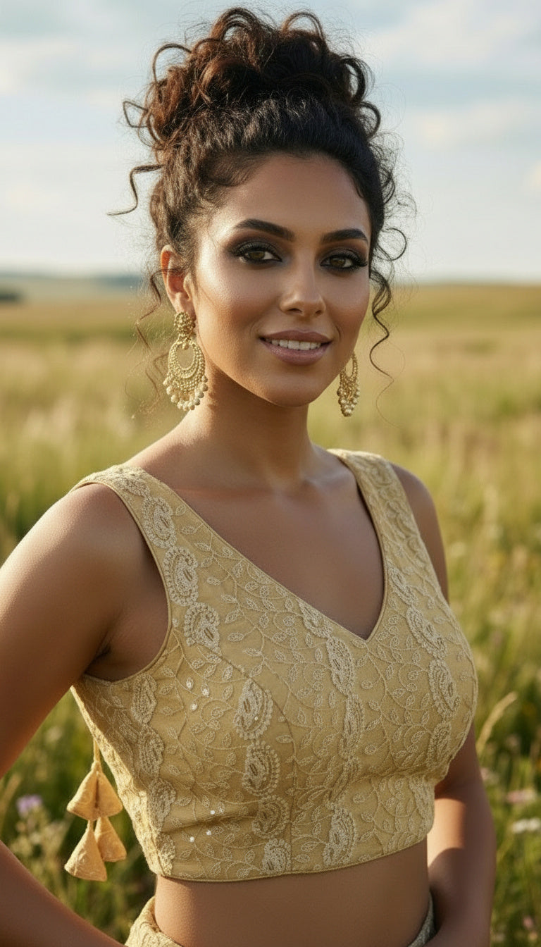 Vistavelle Gold Color V-Neck PR Chikankari Georgette Digital Blouse