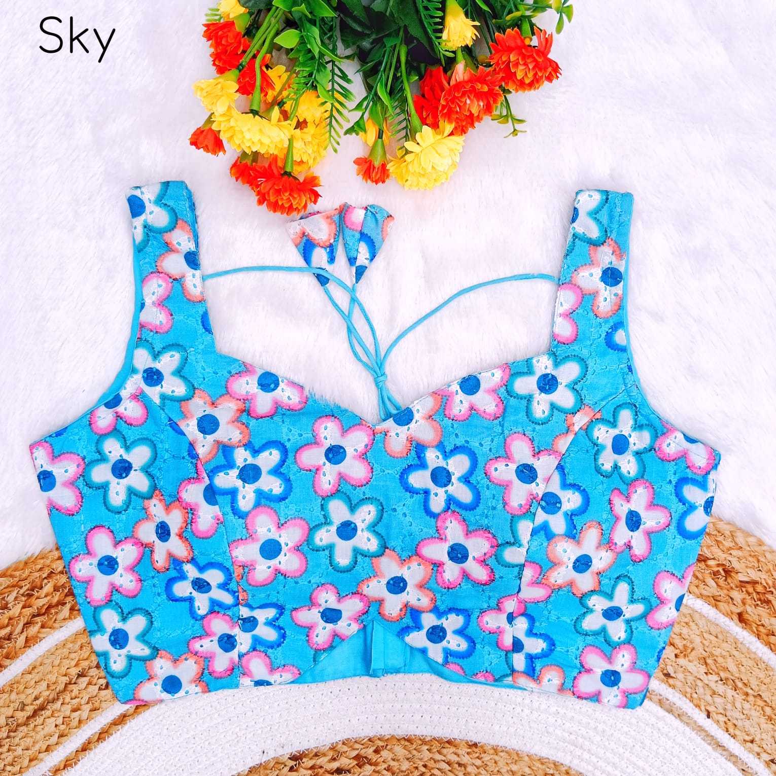 Vistavelle Sky Blue Color V-Neck Hakoba Cotton Chikankari Digital Blouse