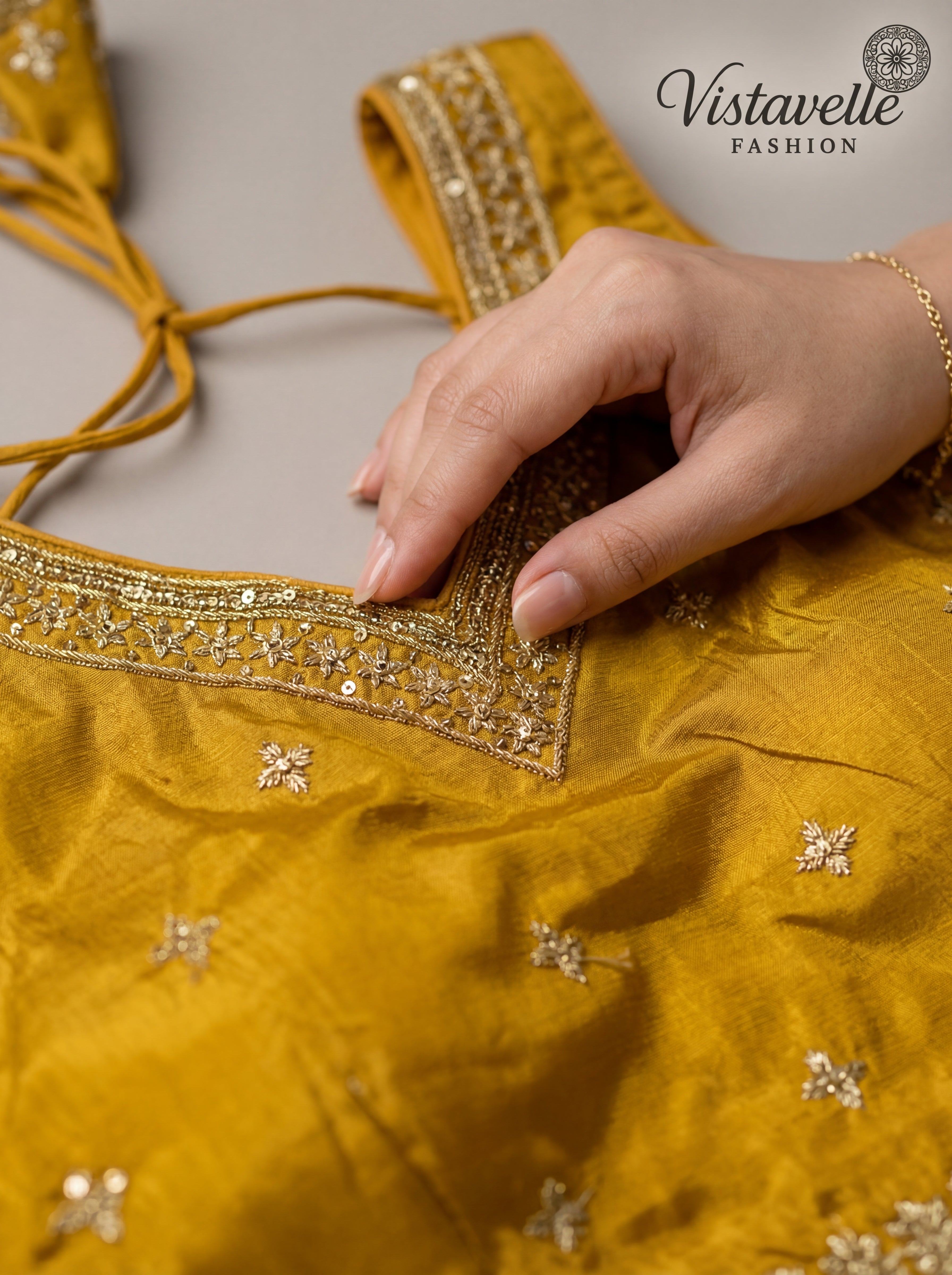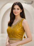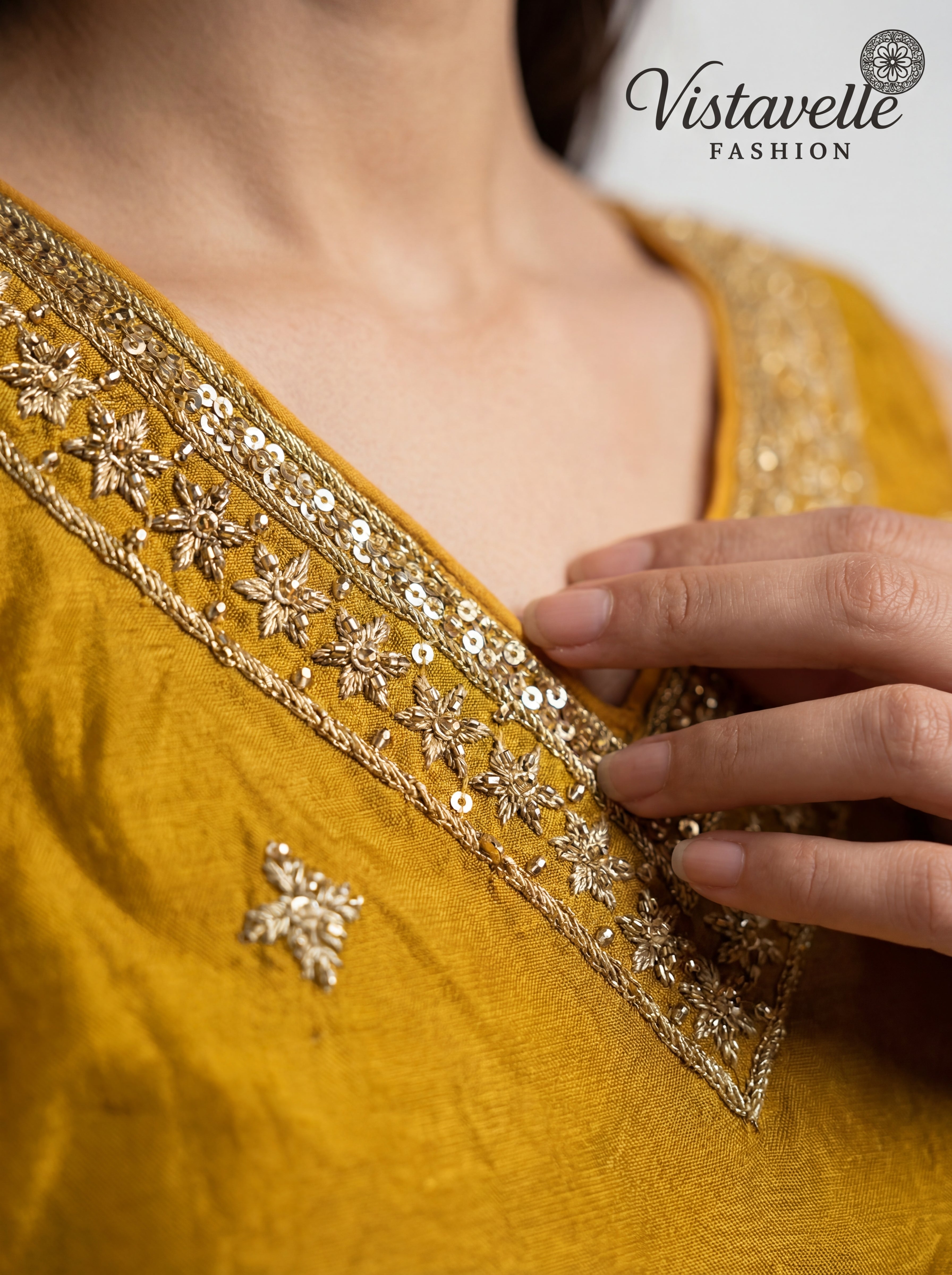 Elevate your ethnic wardrobe with this stunning Mustard Zimmy Chhu Blouse, crafted for elegance, structure, and timeless appeal. Designed with a flattering V-neck silhouette, this blouse features intricate zari and sequence farma embroidery work that adds a luxurious golden contrast against the warm mustard base.