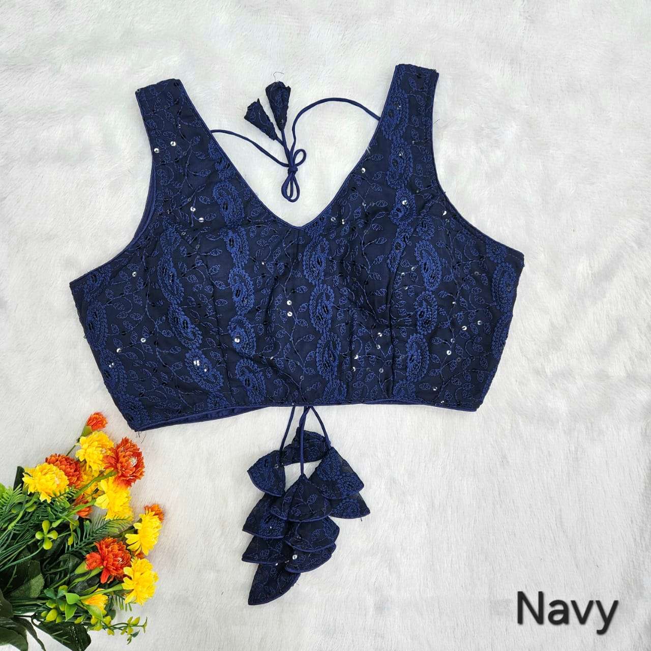Designed for festive occasions, daytime celebrations, and elegant gatherings, this blouse blends graceful detailing with effortless wearability. The soft cotton inner lining enhances comfort, while the classic V-neck and elbow-length sleeves create a flattering and timeless silhouette.