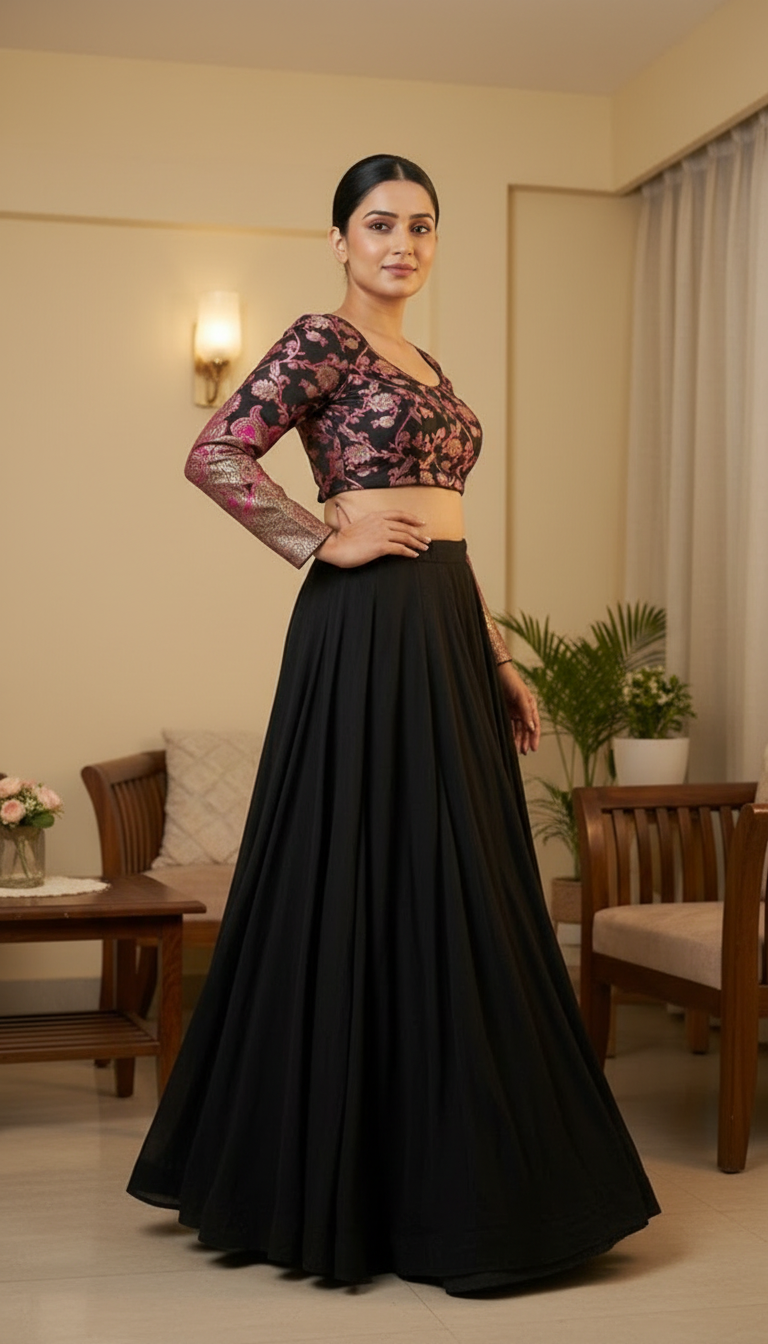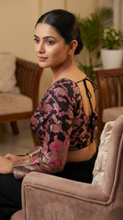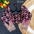 Elevate your ethnic wardrobe with this exquisitely crafted black Dola silk jacquard blouse, designed to bring together traditional artistry and modern elegance. The rich black base is beautifully adorned with intricate floral and paisley jacquard weaving in contrasting tones, creating a striking yet refined look.