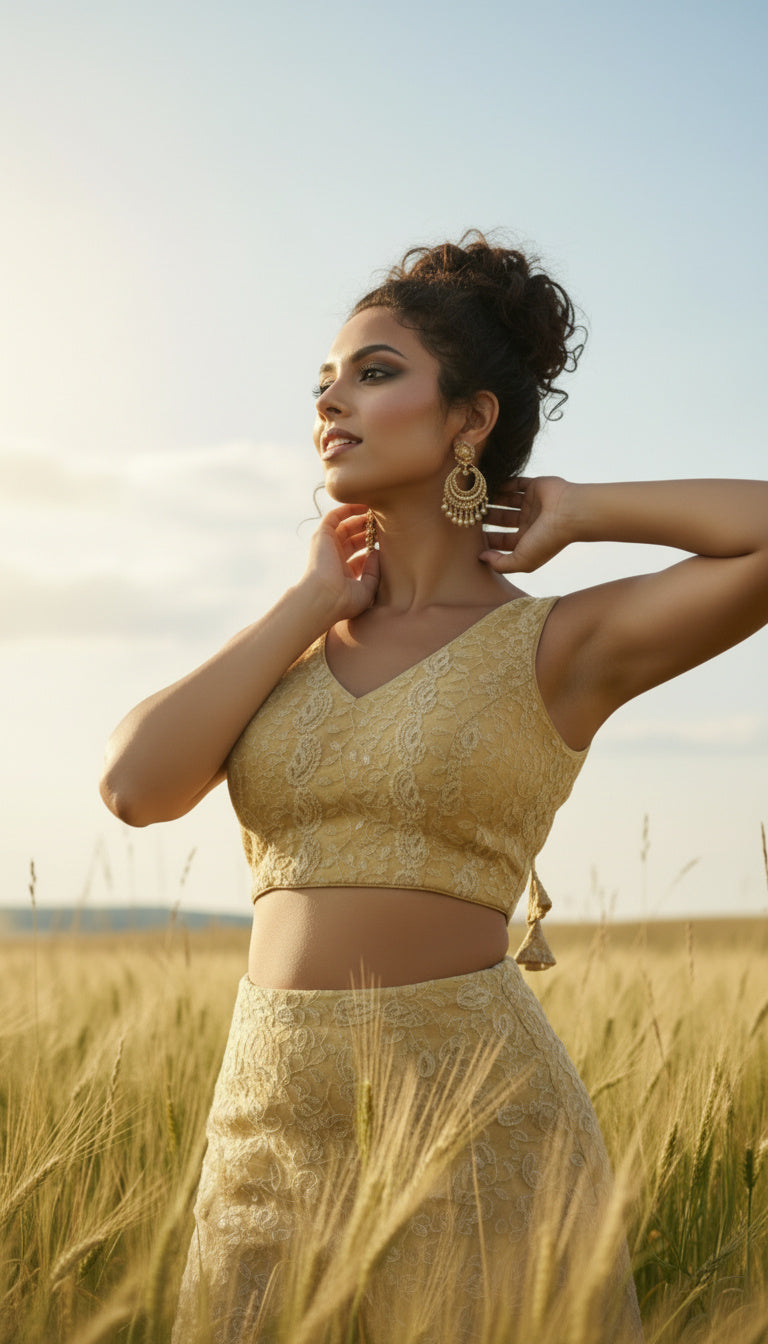 Designed for festive occasions, daytime celebrations, and elegant gatherings, this blouse blends graceful detailing with effortless wearability. The soft cotton inner lining enhances comfort, while the classic V-neck and elbow-length sleeves create a flattering and timeless silhouette.