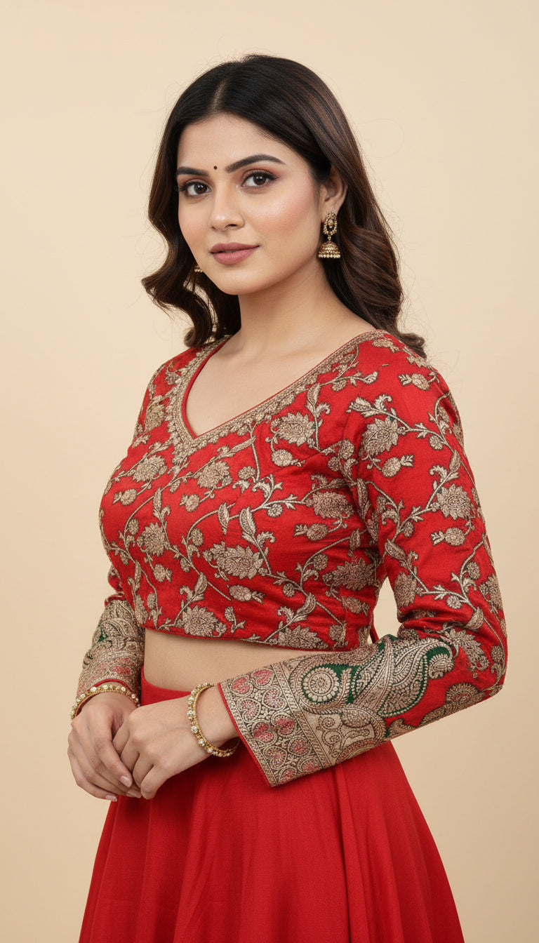Designed with a pan neck pattern, this blouse offers a balanced neckline that complements both classic and modern saree drapes. The full-hand long sleeves (21 inches) are richly woven with detailed jacquard borders, creating a bold statement silhouette ideal for weddings and ceremonial occasions. A double cotton lining ensures breathability and structure, while padding provides a smooth, flattering fit.