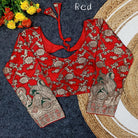 Step into refined elegance with this Pure Dola Silk Jacquard blouse, crafted to deliver a luxurious traditional look with premium comfort. The rich red base is beautifully enhanced with exclusive zari jacquard weaving, featuring intricate floral and paisley motifs in antique gold with subtle green accents that add depth, texture, and a regal festive finish.