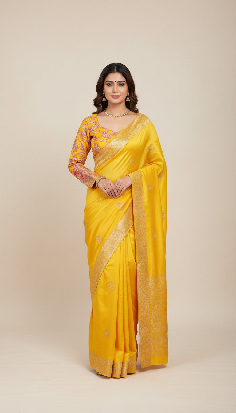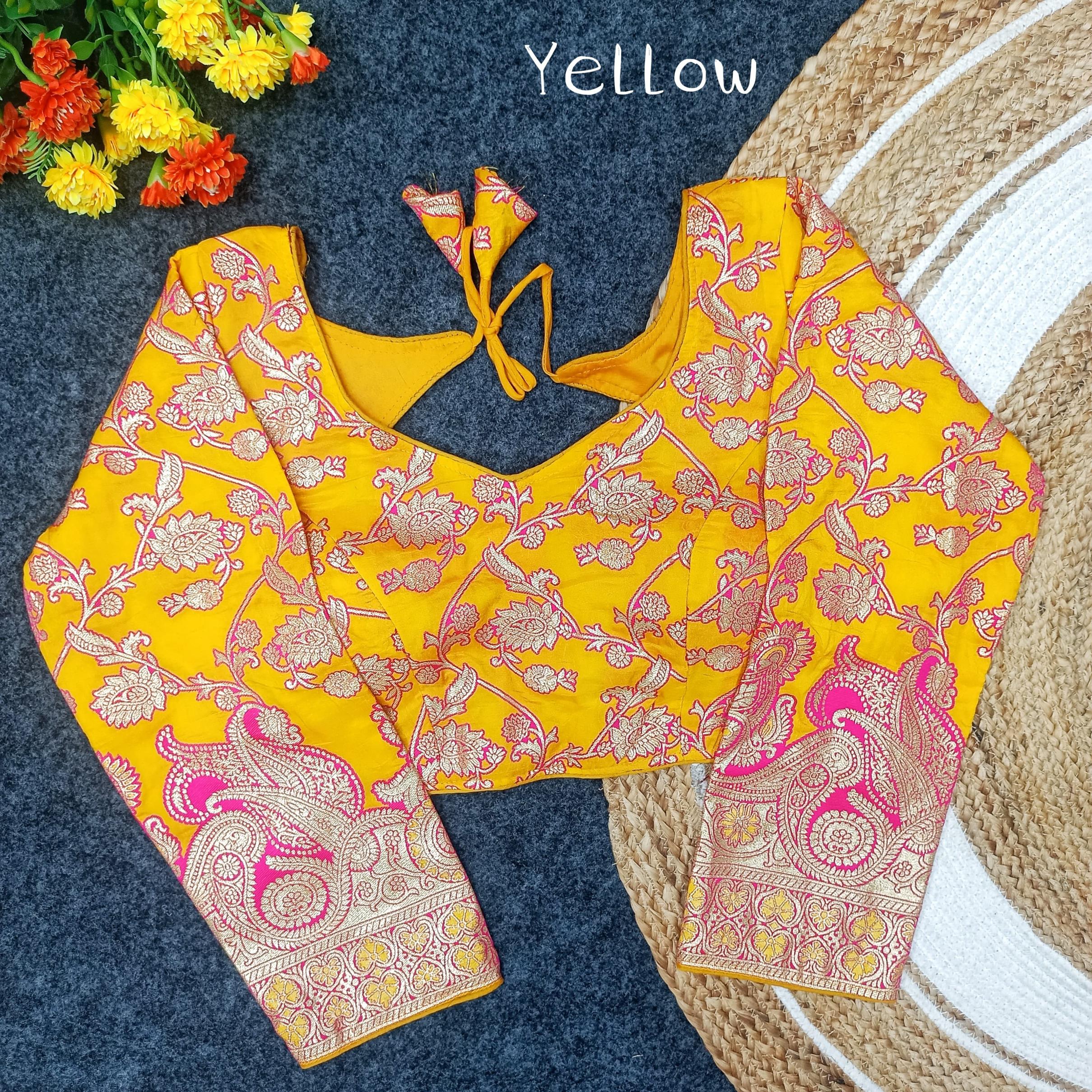 Step into refined elegance with this Pure Dola Silk Jacquard blouse, crafted to deliver a luxurious traditional look with premium comfort. The vibrant yellow base is beautifully enhanced with exclusive zari jacquard weaving, featuring intricate floral and paisley motifs in soft gold and pink tones that add richness, warmth, and a festive glow.