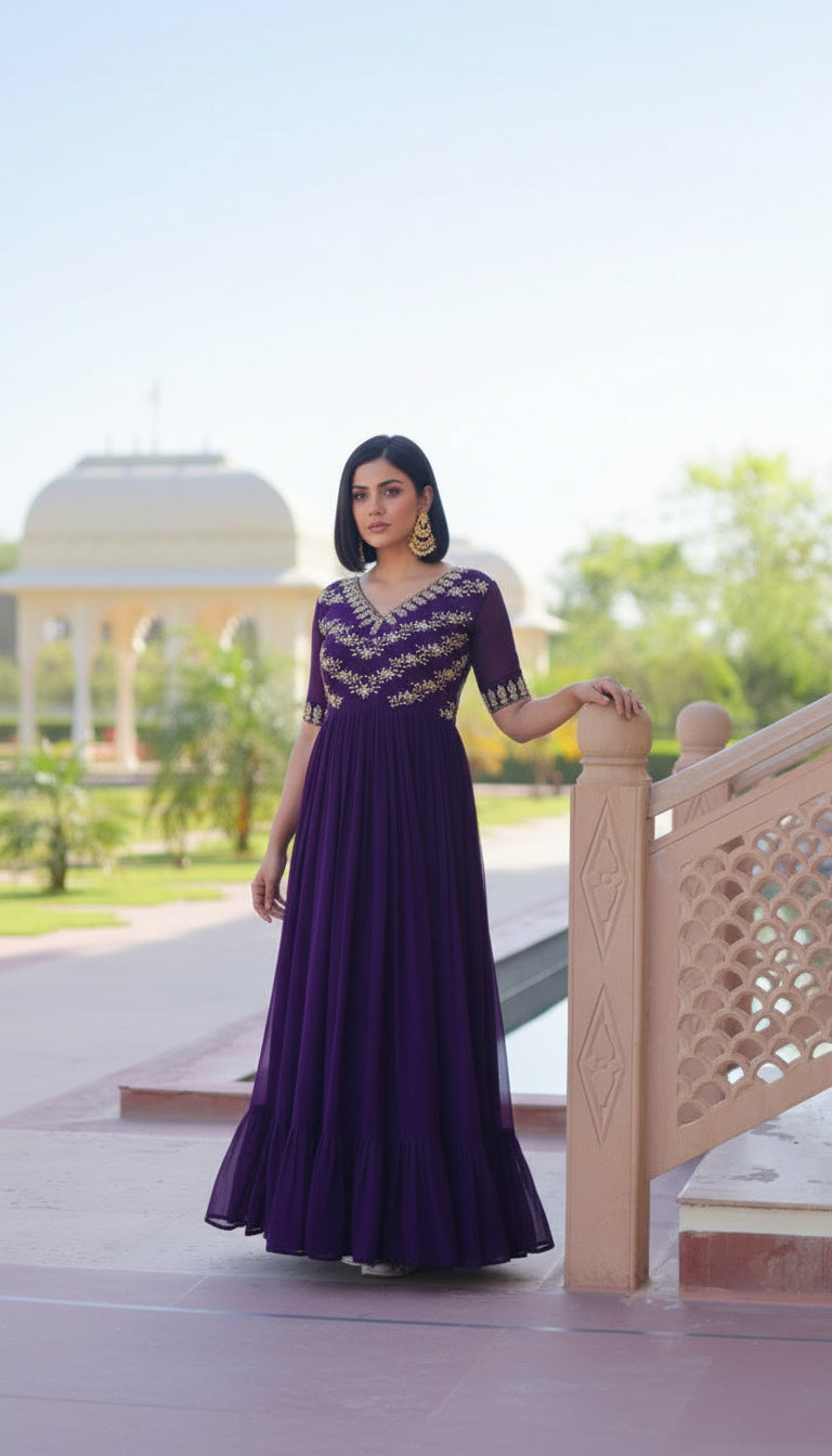 The gown is enhanced with a fancy V-neckline and half sleeves, creating a balanced look that is both elegant and comfortable. A full cotton lining from top to bottom ensures ease of wear, while the frill stitching and generous flare add fluid movement and visual drama.
