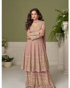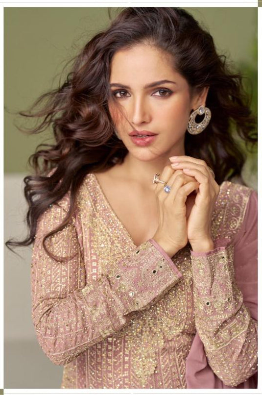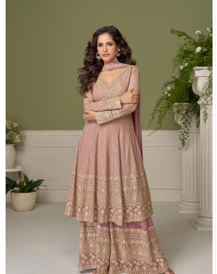 Step into refined elegance with this beautifully crafted Blush Rose palazzo suit set, designed to offer a graceful silhouette, fluid movement, and soft festive charm. Crafted from premium Real Georgette fabric, this fully stitched ensemble is enriched with intricate embroidery and delicate handwork, creating a luxurious finish with subtle shimmer and depth.