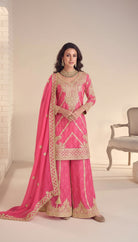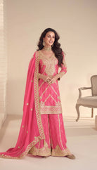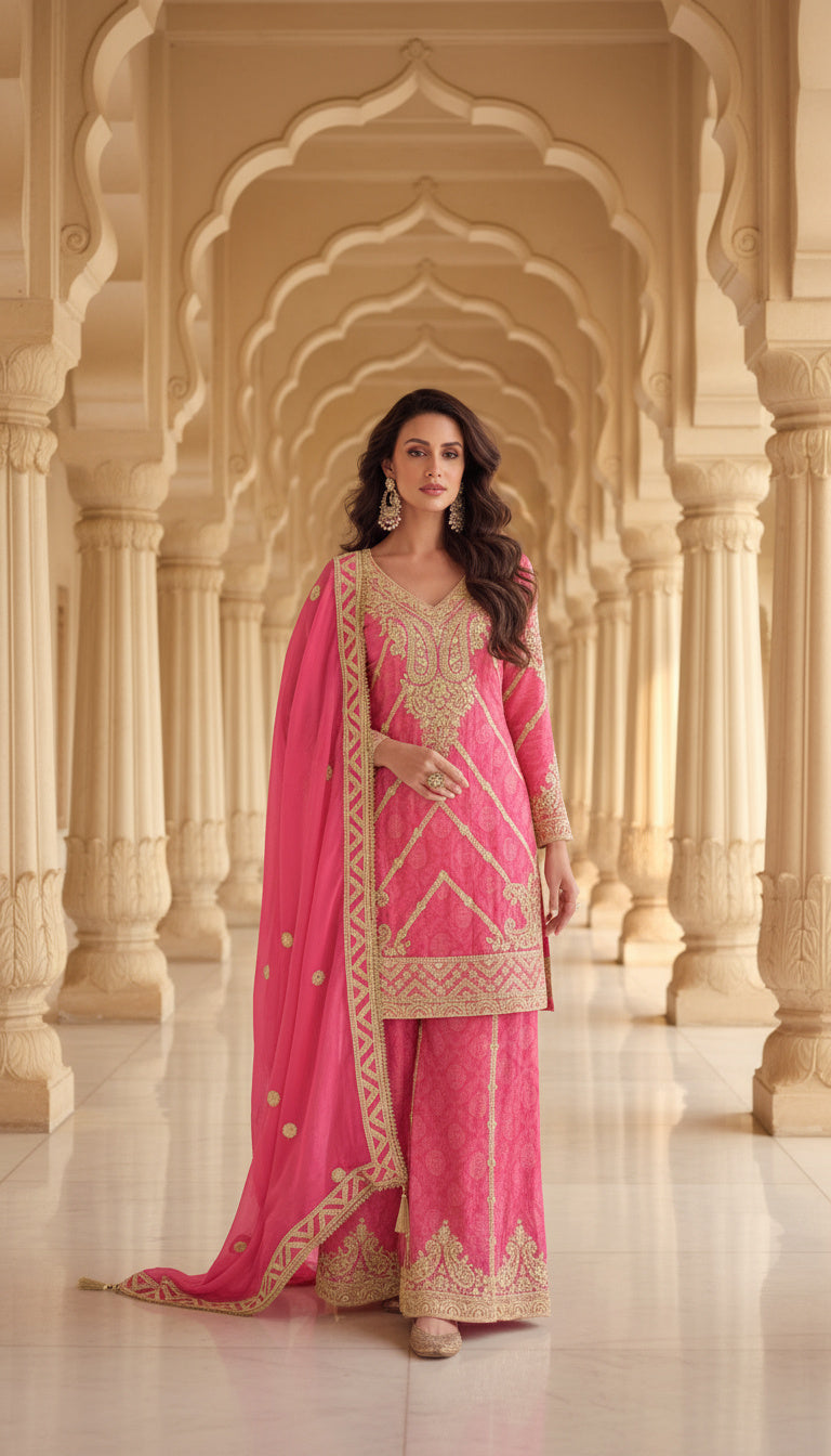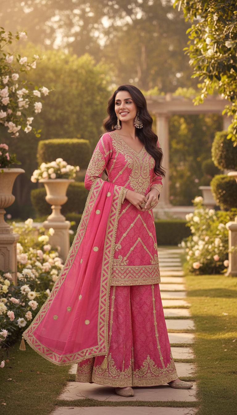 Elevate your ethnic wardrobe with this elegantly crafted palazzo suit set, designed to offer a refined silhouette with graceful movement and a luxurious finish. Made from premium Chinon fabric, this fully stitched ensemble showcases intricate zari and sequin embroidery that adds depth, texture, and a rich festive appeal.