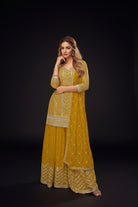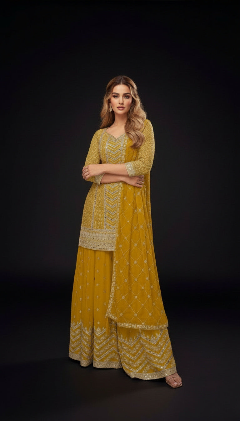 The fully stitched design features an elegantly embroidered top paired with a coordinated Chinon palazzo and matching dupatta. The delicate embroidery work enhances the overall appeal while maintaining ease of wear and breathability. Thoughtfully constructed for comfort and style, this set transitions effortlessly across festive gatherings, celebrations, and formal events.