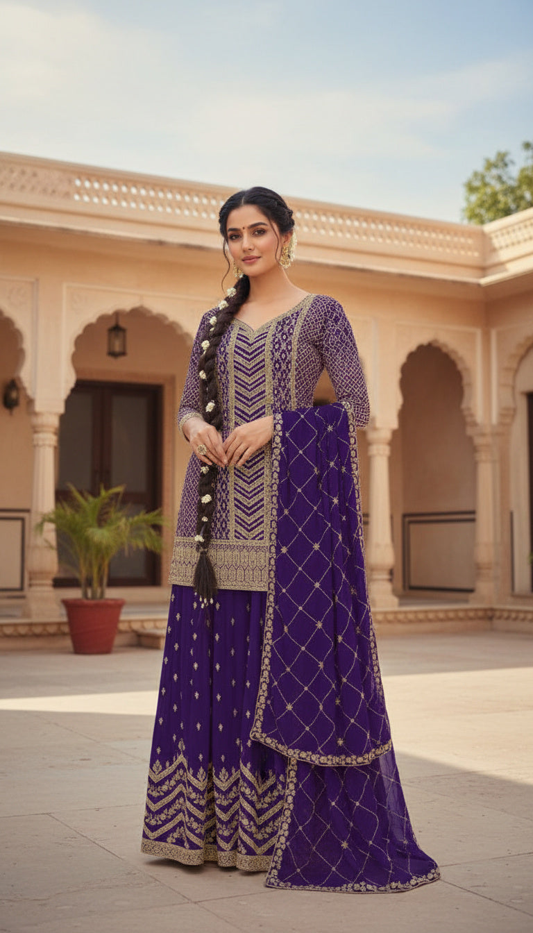 Ideal for those seeking premium ethnic wear with timeless charm, this palazzo suit set combines elegance, comfort, and ready-to-wear convenience.