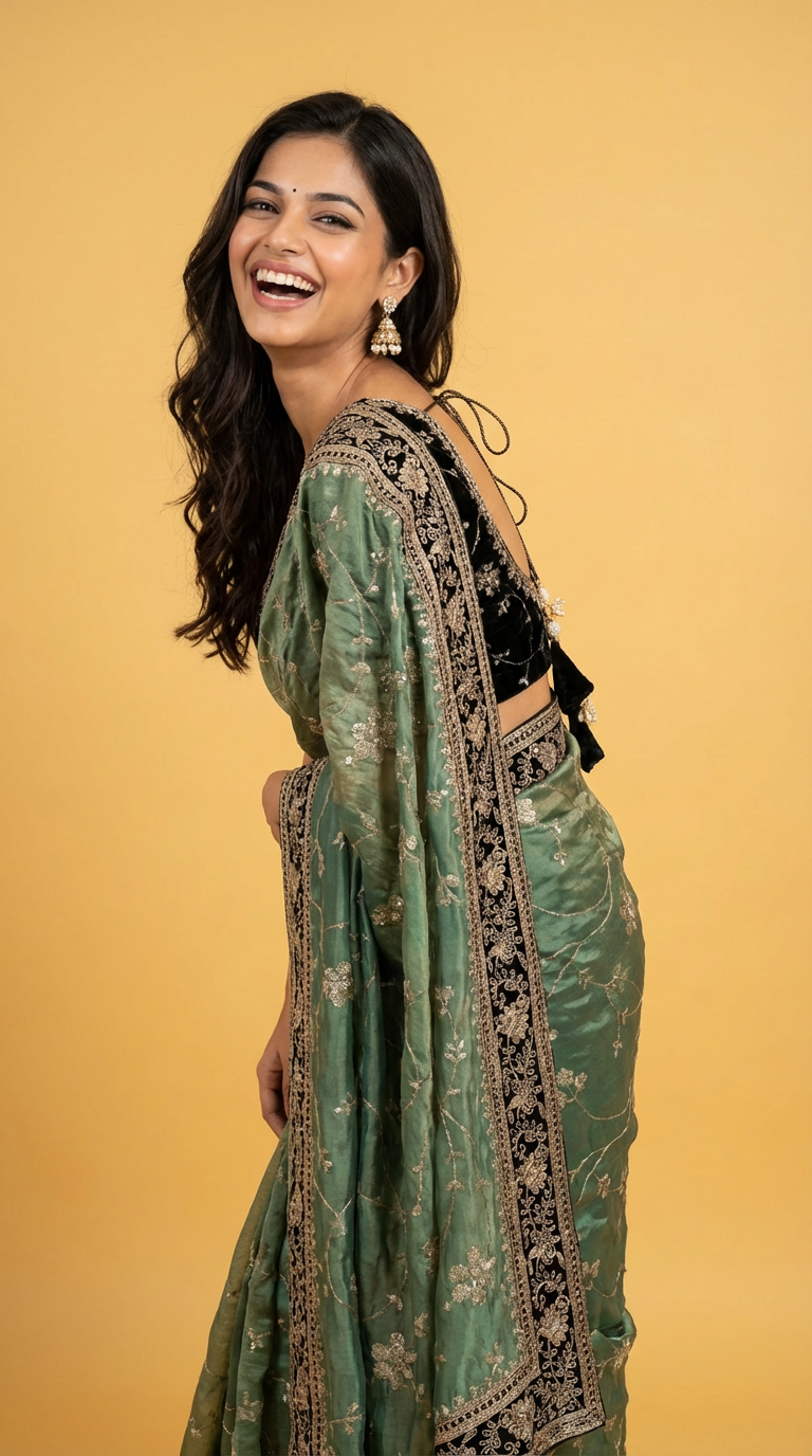 Teal Moss Silk Saree with Velvet Lace Border & Zari Embroidery with Viscose Velvet Blouse