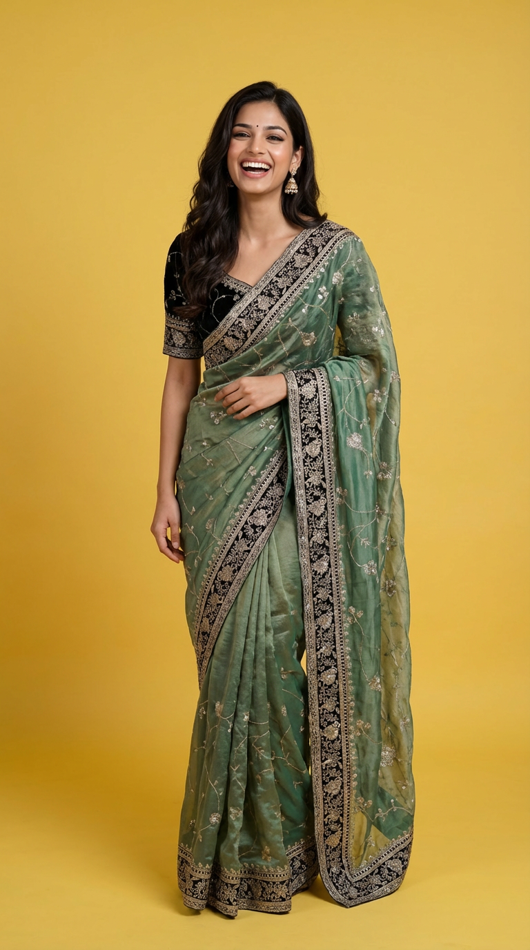 Green Gold Georgette Saree with Embroidered Stitched Blouse – Regal Wedding & Reception Wear | Ships from USA