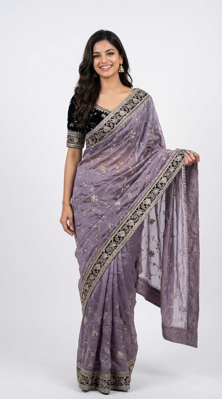 Lavender Grey Moss Silk Saree with Velvet Lace Border & Zari Embroidery with Viscose Velvet Blouse