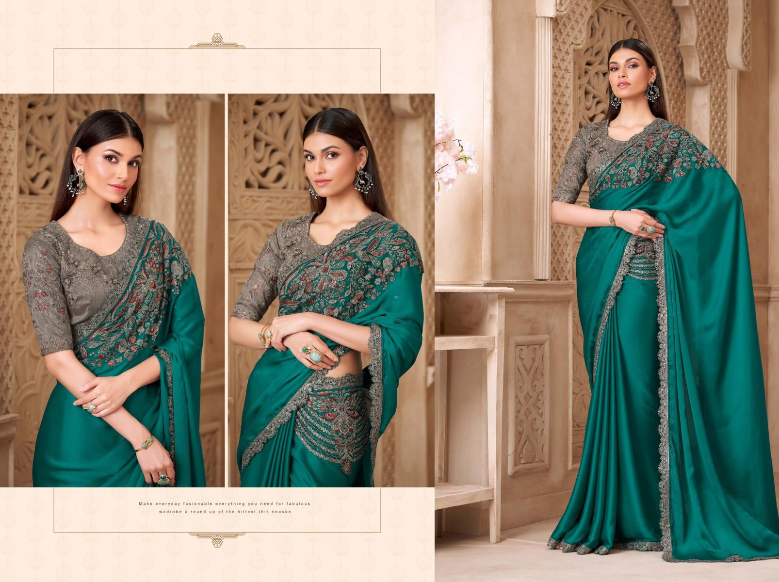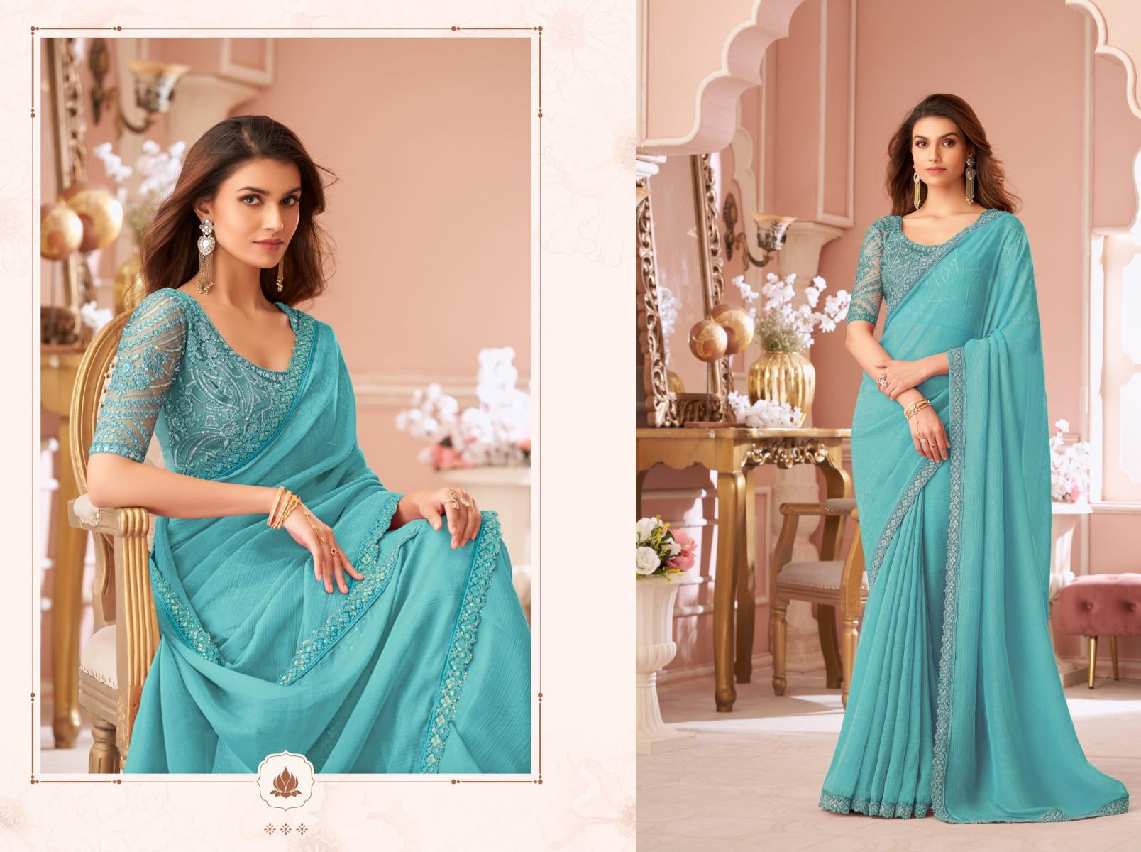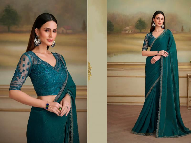 Premium Teal Designer Saree with Embroidered Border & Stitched Blouse – Elegant Party & Wedding Wear for Women