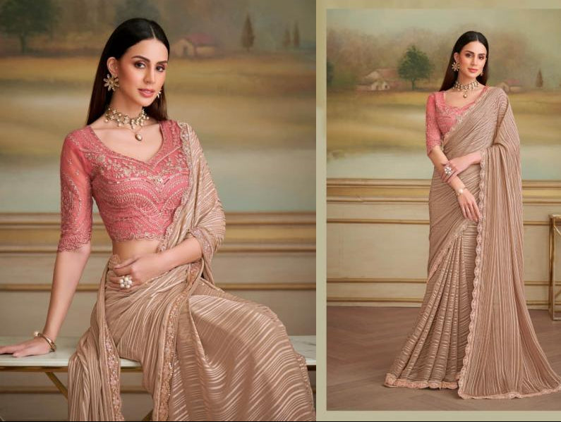 Twin Shade Beige Georgette Saree with Stitched Work Blouse – Elegant Wedding & Reception Wear | Ships from USA