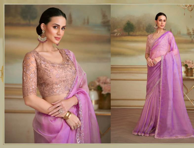 Lavender Tissue Georgette Saree with Embroidered Stitched Blouse – Elegant Wedding & Reception Wear | Ships from USA