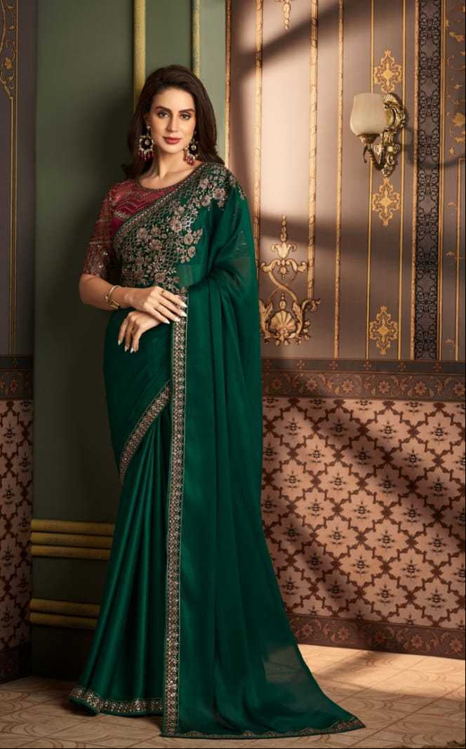 Bottle Green Designer Georgette Saree with Embroidered Stitched Blouse – Elegant Wedding Reception Party Wear