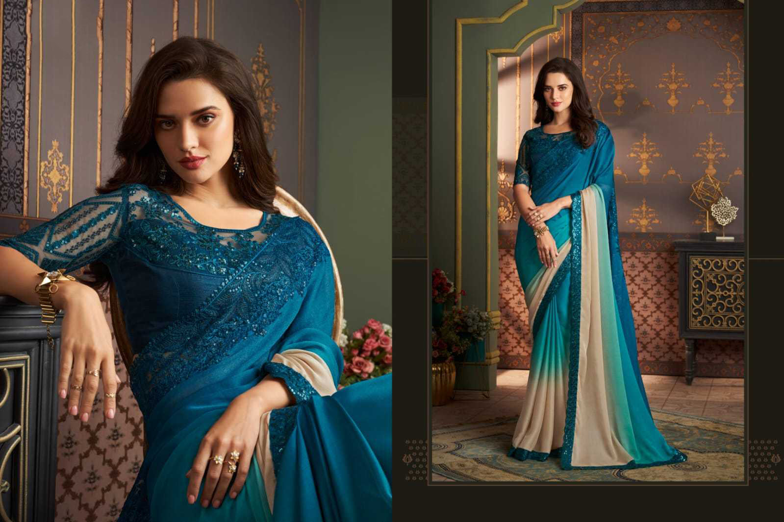 Teal Blue Shaded Silver Chiffon Saree with Stitched Banglori Silk Blouse Wedding Reception Designer Saree USA