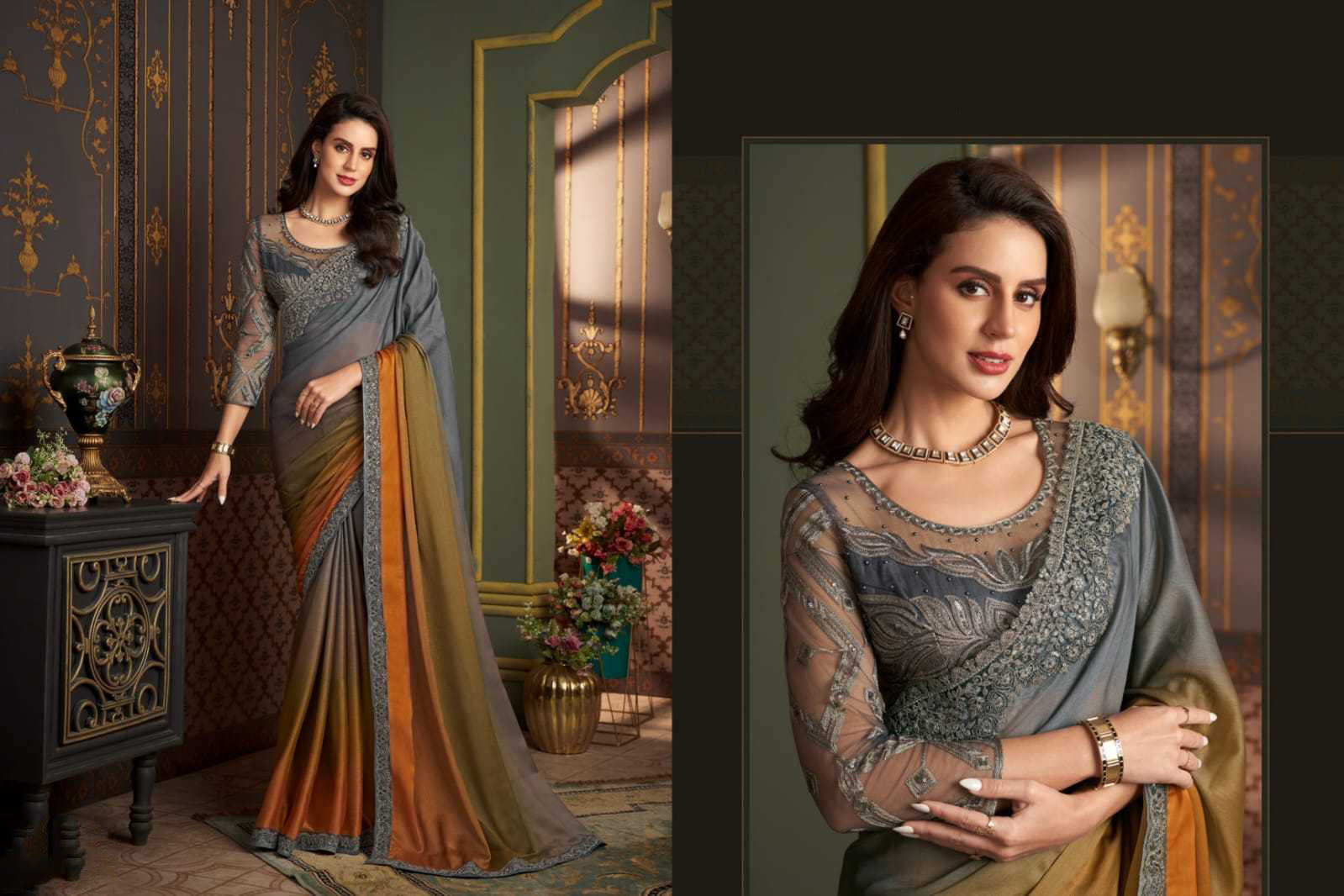 Grey Mustard Shaded Silk Saree with Stitched Blouse – Designer Wedding Festive Party Wear Saree USA