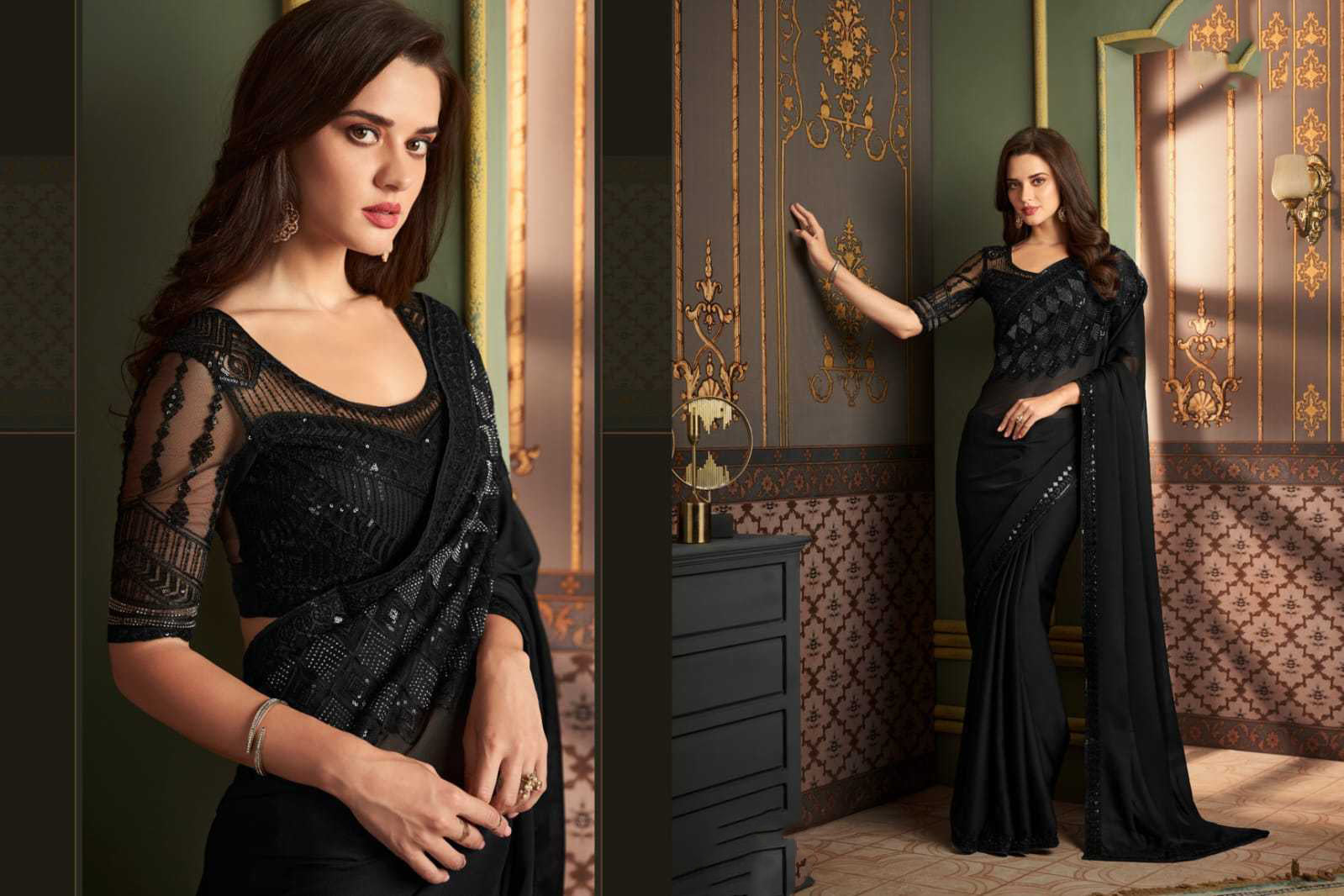 Midnight Black Designer Silk Chiffon Saree with Stitched Work Blouse