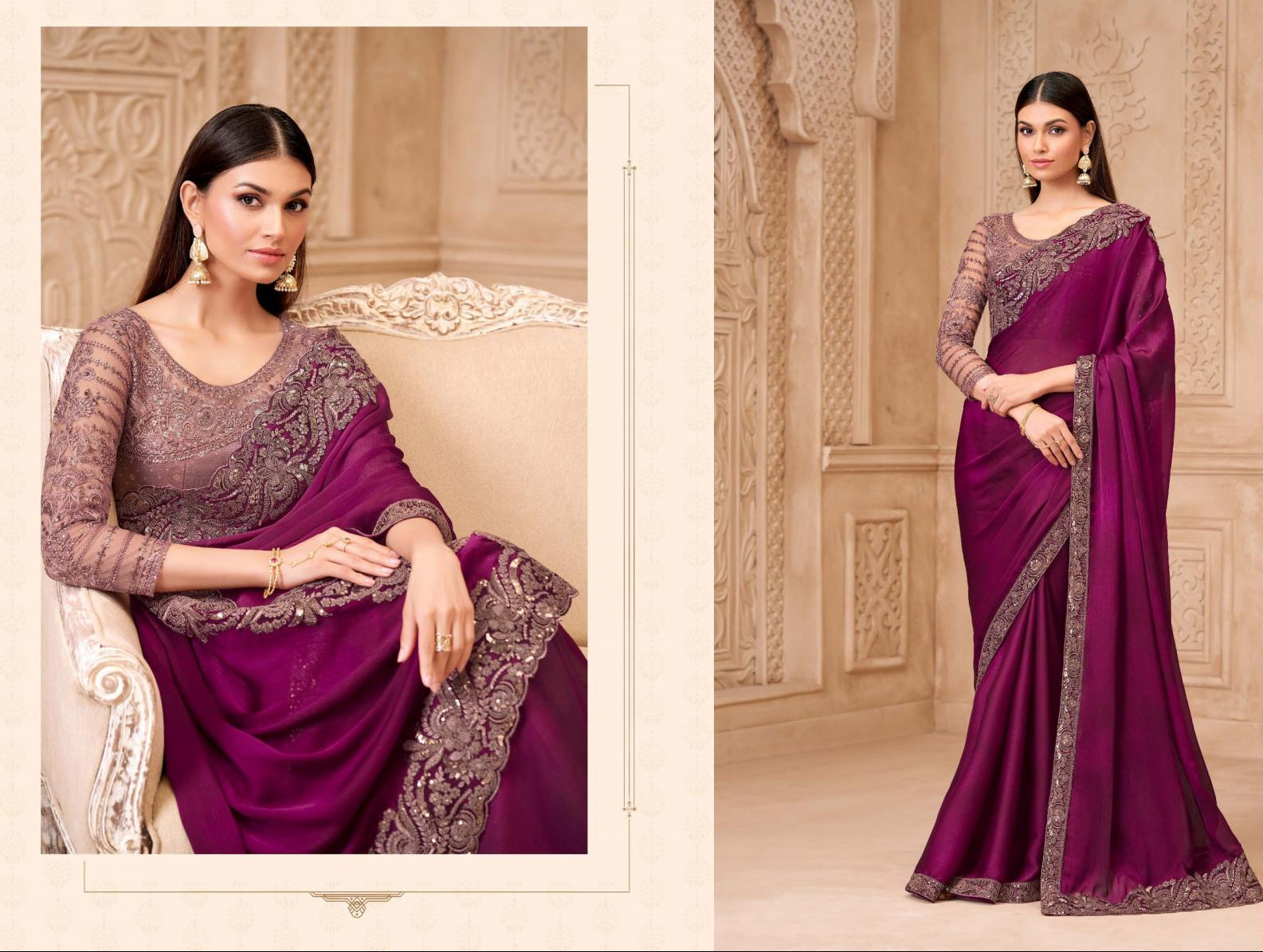 Rich Wine Satin Georgette Saree with Brocade Silk Blouse – Wedding & Reception Saree USA
