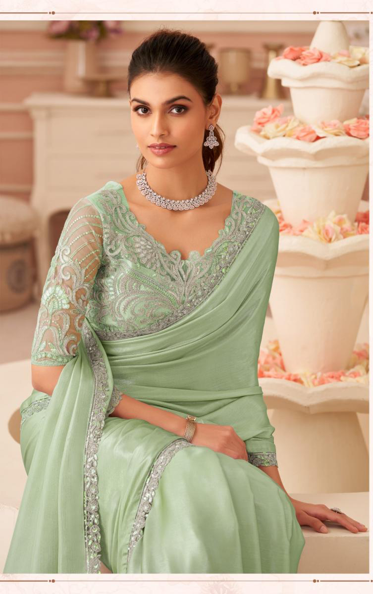 Pistachio Bloom Chiffon Shimmer Embroidered Saree with Fall & Pico Fully Stitched Blouse