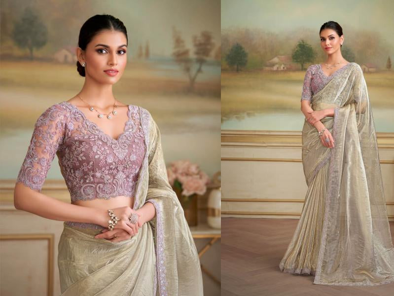 Radiant and sophisticated, this Champagne Gold Tissue Georgette Saree embodies timeless luxury with a modern glow. The subtle shimmer of tissue georgette enhances its graceful drape, while the intricately embroidered stitched blouse and refined border detailing add elevated elegance.