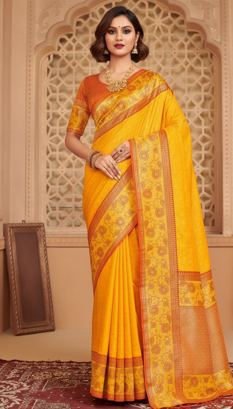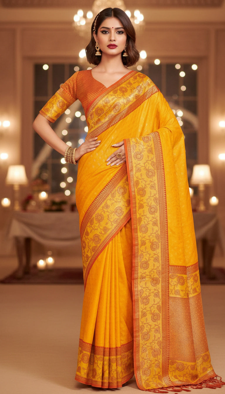 Yellow and Orange Designer Silk Fabric Saree with Fall & Pico Fully Stitched Blouse