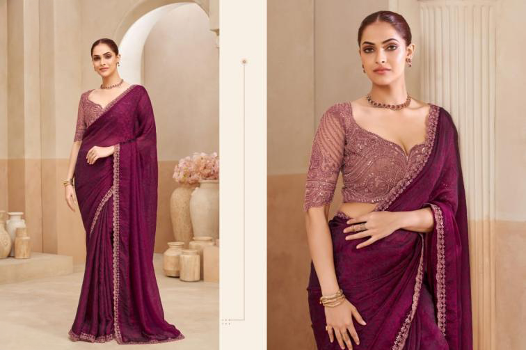 Discover regal elegance with this high-end saree, thoughtfully designed for grand celebrations and memorable occasions. Crafted to deliver a luxurious presence, the saree features a sophisticated two-tone shimmer finish that subtly transforms under different lighting, adding depth, movement, and refined allure to every drape.