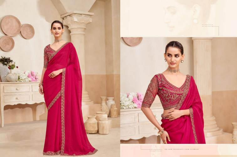 Pair this saree with statement earrings and elegant heels for wedding or reception looks. For evening celebrations, elevate the ensemble with bold accessories and a sleek hairstyle to highlight the shimmer finish and embroidered blouse.