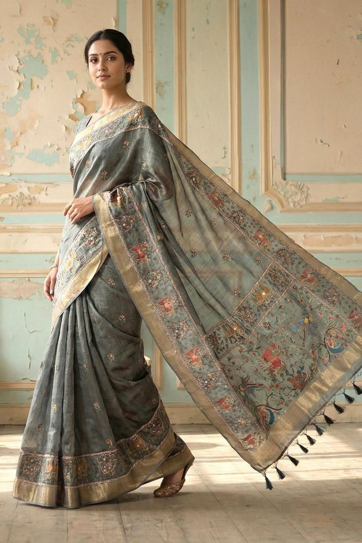Vistavelle Collection Slate Grey Simmer Silk Saree with Intricate Aari Work & Stitched Blouse