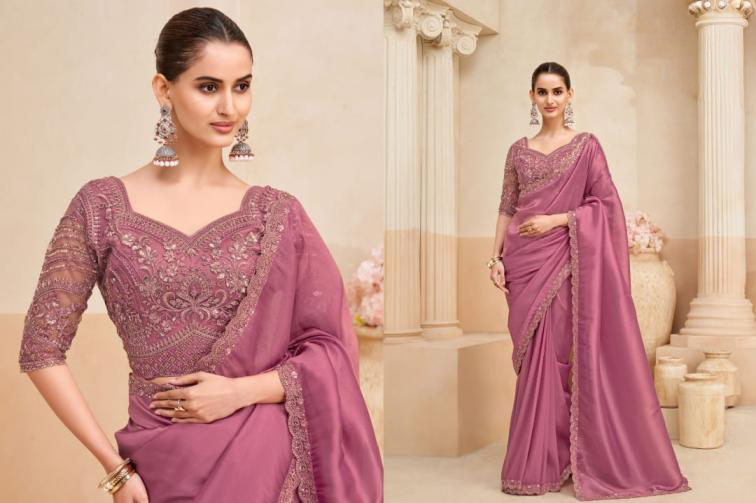 Rose Bronze Fendi Saree with Fall & Pico Embroidered Designer Fully Stitched Blouse