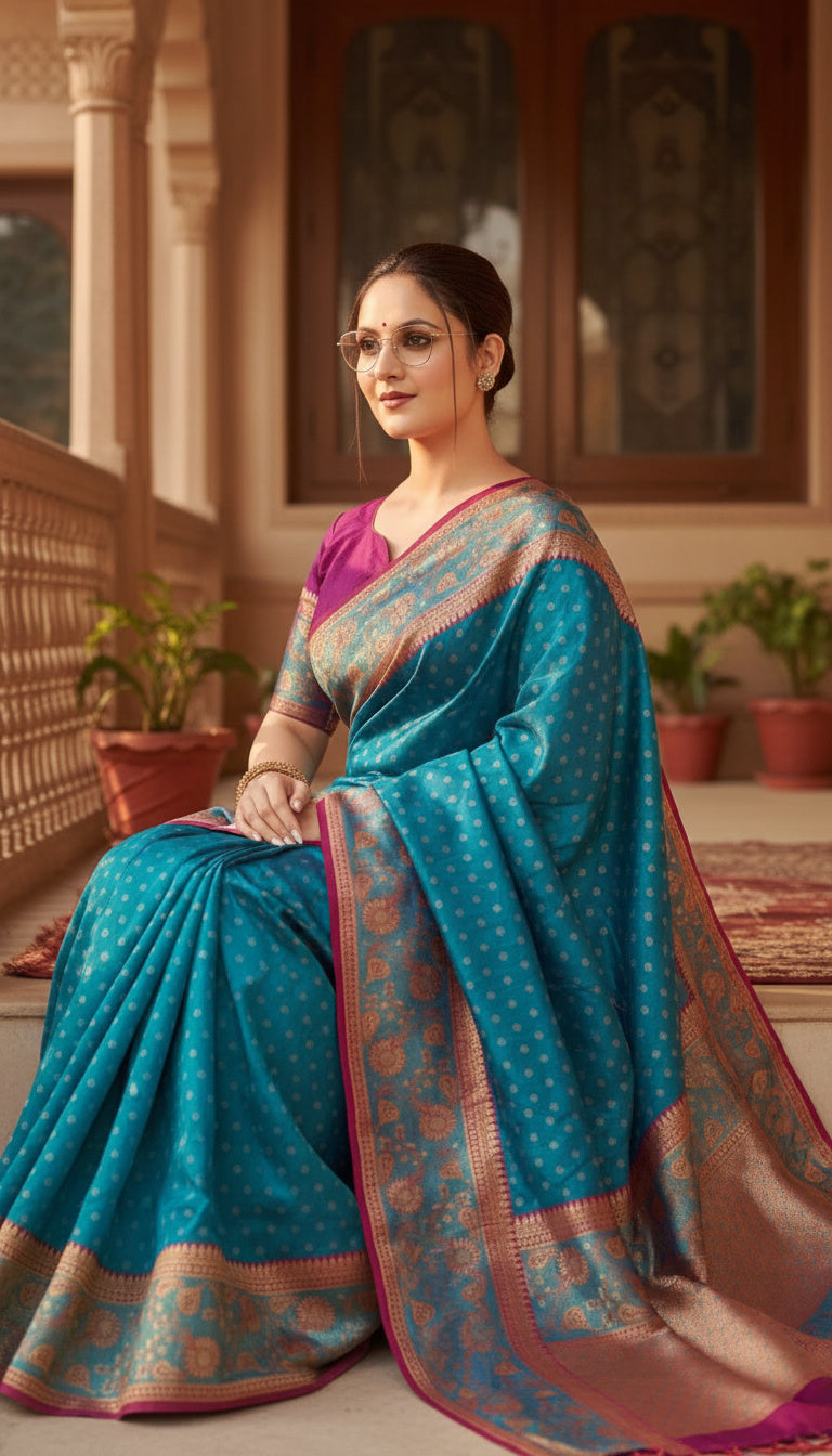 Vistavelle Soft Silk Teal Blue and Rani Pink Traditional Saree with Satin Border