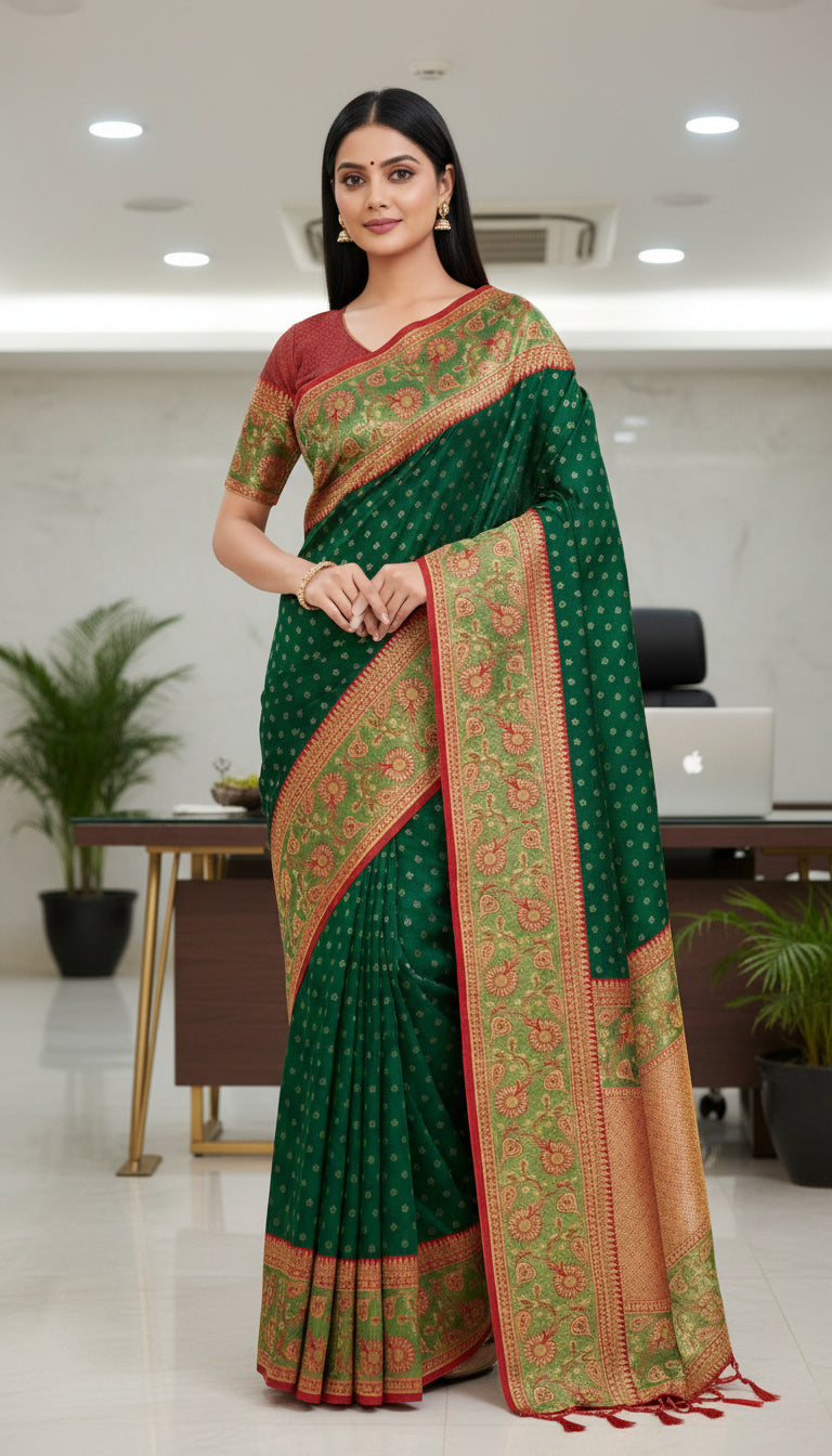Green and Red Designer Silk Fabric Saree with Fall & Pico Fully Stitched Blouse