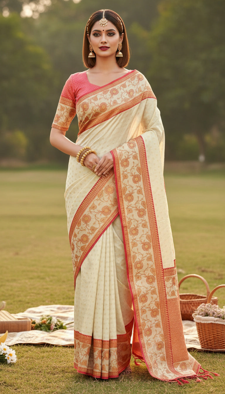 Vistavelle Soft Silk Cream Beige and Rani Pink Traditional Saree with Satin Border