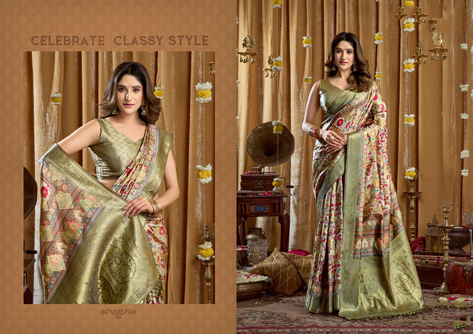 Vistavelle Olive Gold Digital Cluster Print Saree with Banarasi Border
