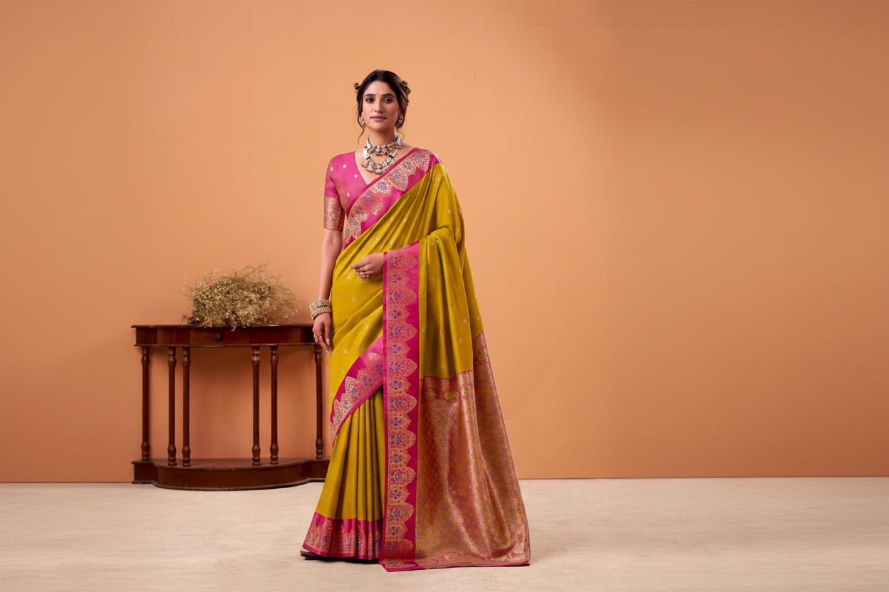 Vistavelle Soft Silk Mustard Yellow and Rani Pink Traditional Saree with Satin Border