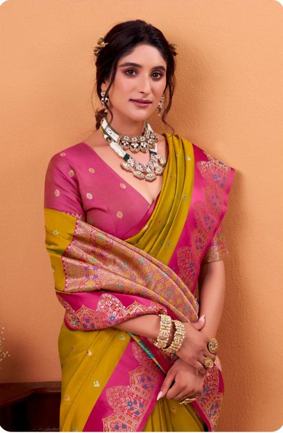 Vistavelle Mustard Yellow & Rani Pink Patola Silk Traditional Saree