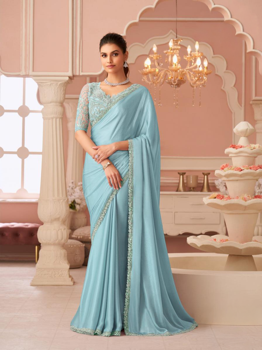 Sky Aqua Chiffon Shimmer Embroidered Saree with Fall & Pico Fully Stitched Blouse