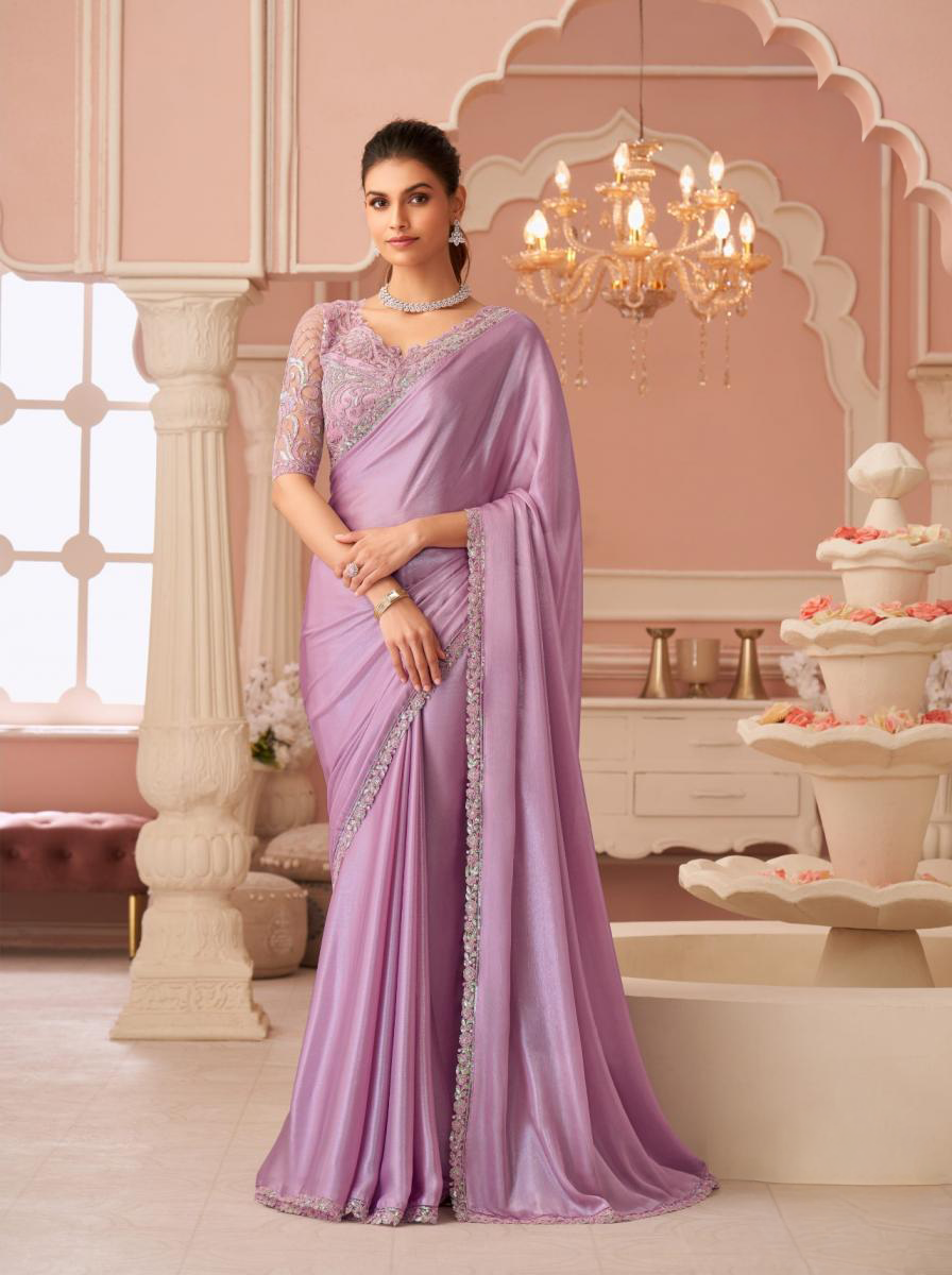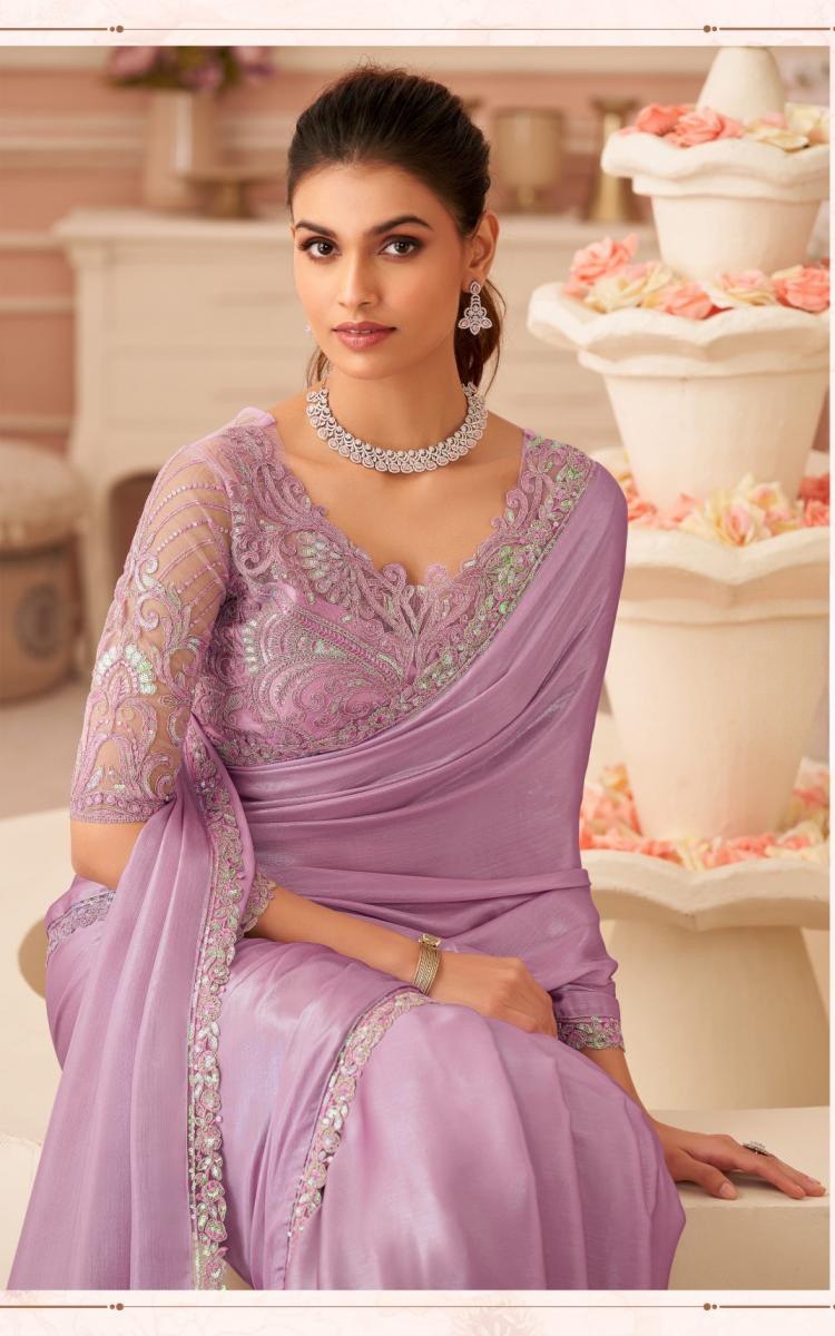Lavender Mist Chiffon Shimmer Embroidered Saree with Fall & Pico Fully Stitched Blouse