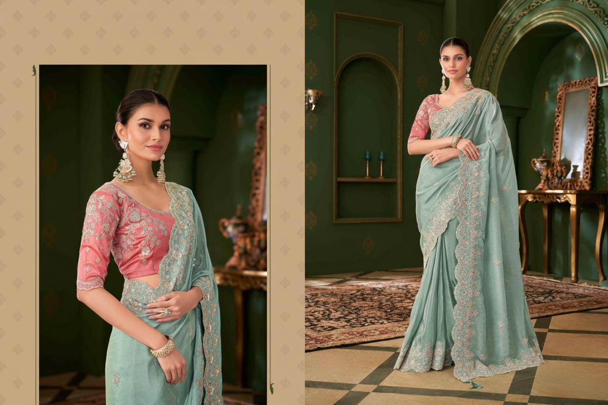 Sage Mist Chiffon Shimmer Embroidered Saree with Fall & Pico Fully Stitched Blouse