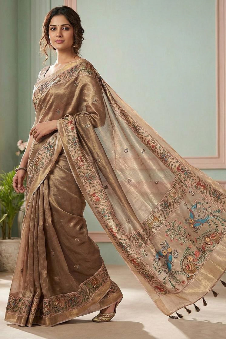 Vistavelle Collection Golden Bronze Simmer Silk Saree with Intricate Aari Work & Stitched Blouse