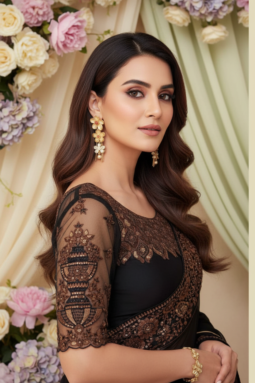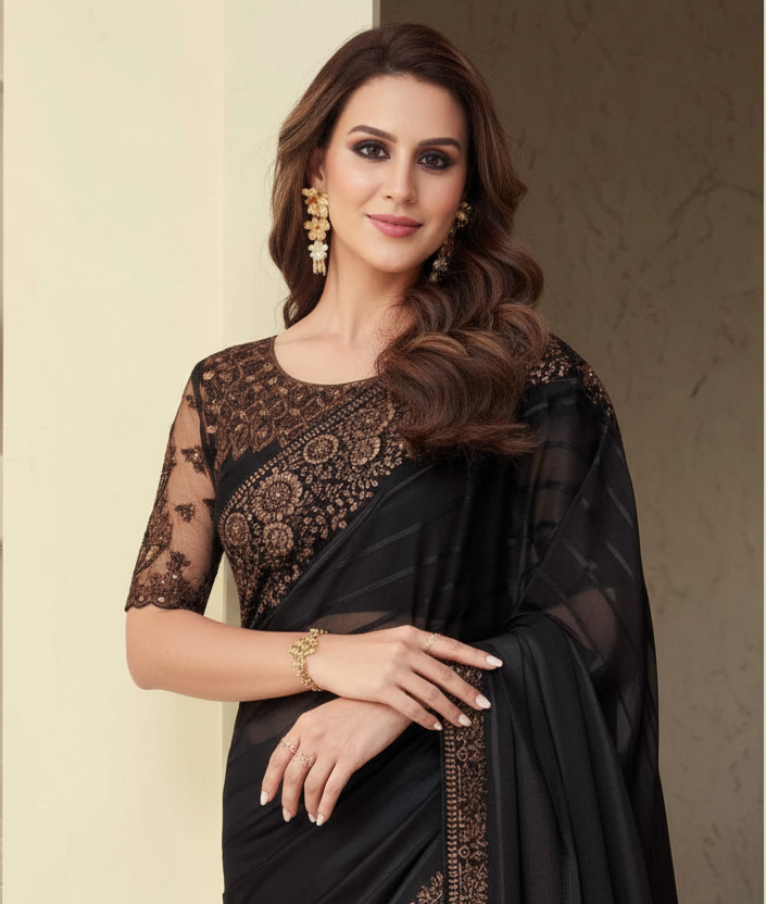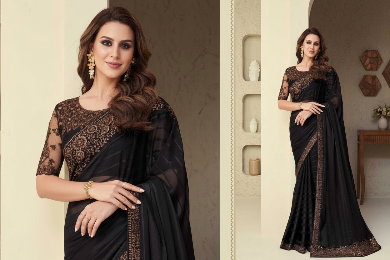 Black Satin Georgette Saree with Jacket Work Blouse – Wedding & Festive Designer Wear | Ships from USA