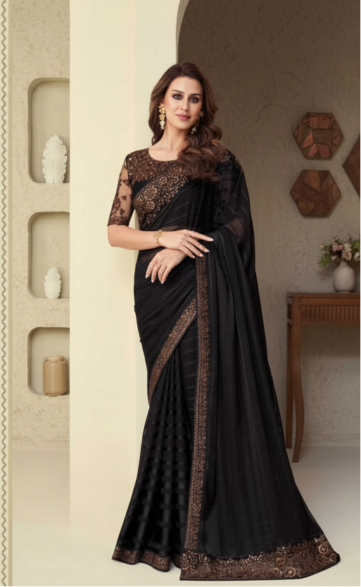 Black Shimmer Silk Saree with Heavy Zari Embroidered Blouse – Designer Wedding & Reception Outfit USA